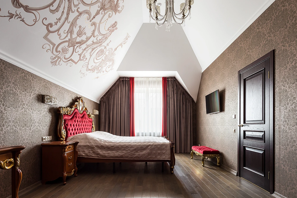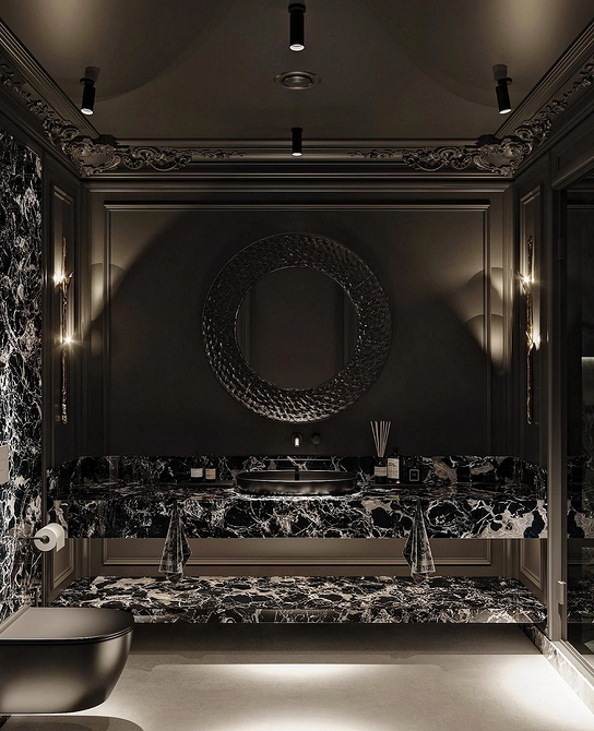 Если же вы хотите оформить таким образом все стены, обязательно разбавьте их крупными светлыми изделиями, белым потолком, крупными зеркалами. Желательно, чтобы в комнате были большие окна и высокие потолки, а также важно продумать достаточное и разноплановое освещение.