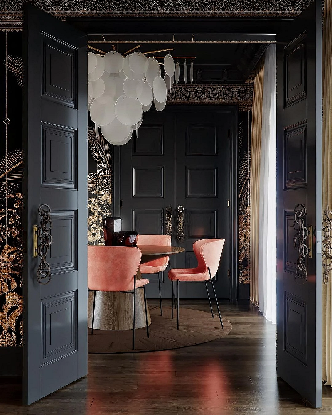 Темные проемы — интересный и эффектный дизайнерский прием, который делает пространство более графичным, а также «собирает» его.