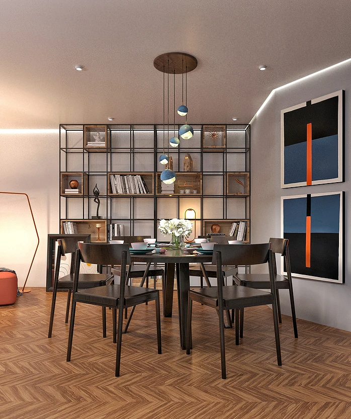 Интересный прием, который сделает пространство более легким и просторным даже при обилии темных элементов, — подобрать мебель в тон напольному покрытию. Например, это могут быть ножки стульев или стол в похожем оттенке. Тогда будет казаться, что предметы как бы «парят» в воздухе, и это сразу визуально разгрузит комнату.