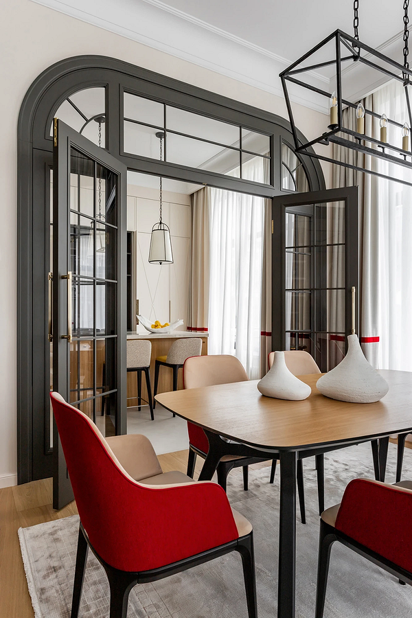 Часто цвет в интерьер вводят через акцентную мебель. Этот прием можно сделать интереснее: подобрать не просто диван или пуф яркого оттенка, а предметы, сочетающие в себе два цвета. Например, в этом проекте столовую зону дополнили изящными полукреслами с двойной обивкой. Внутри она спокойного кремового цвета, снаружи — ярко-красная. Получилось несколько ярких и в то же время деликатных акцентов. Их подчеркивают шторы в такой же цветовой схеме.