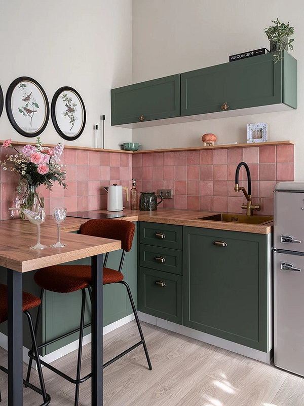 Чтобы яркий интерьер выглядел гармонично, выбирайте проверенные цветовые пары, которые психологически комфортны для человека. Например, в этой уютной однушке использовали комбинацию зеленого и розового. Она уже считается классикой и может давать разные эффекты в зависимости от оттенков. Обратите внимание: здесь дизайнер выбрала не чистые, а сложные приглушенные оттенки. Они сочетаются по цветовой температуре, не спорят друг с другом и не нагружают пространство излишней яркостью. Их дополняют спокойные нейтральные тона — это тоже базовый прием, который уравновешивает активные сочетания.