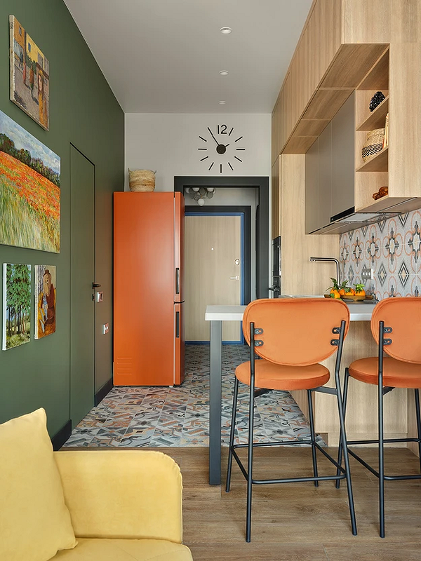 Чтобы цветовой акцент не выглядел инородно, его можно «заякорить» вторым предметом в том же оттенке. В этой студии такой парой стали оранжевые барные стулья и холодильник им в тон на кухне. Последнее — вдвойне необычно, так как цветная техника появляется в интерьерах редко. Пара элементов не просто перекликается по цвету, но еще и находится по диагонали. Это делает распределение цвета более гармоничным.