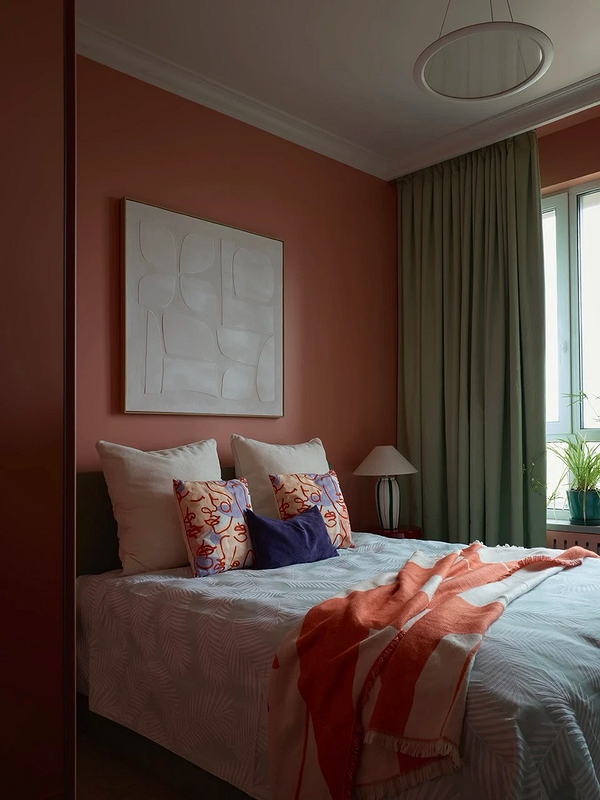 Если вам хочется добавить в комнату смелый активный цвет, например, оранжевый или розовый, подберите красивый разбеленный или припыленный оттенок. Сложные, неявные тона выглядят элегантно и дорого, а главное — не вызывают перевозбуждение или другие нежелательные реакции. Посмотрите, как сделали в этой яркой трешке. Дизайнер использовала оранжевый и на кухне, и в спальне, причем как основной цвет. Но за счет того, что это нежный персиковый оттенок с розовым отливом, он не утомляет и не раздражает. Даже наоборот, такой цвет обволакивает и создает атмосферу уюта.
