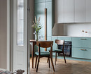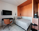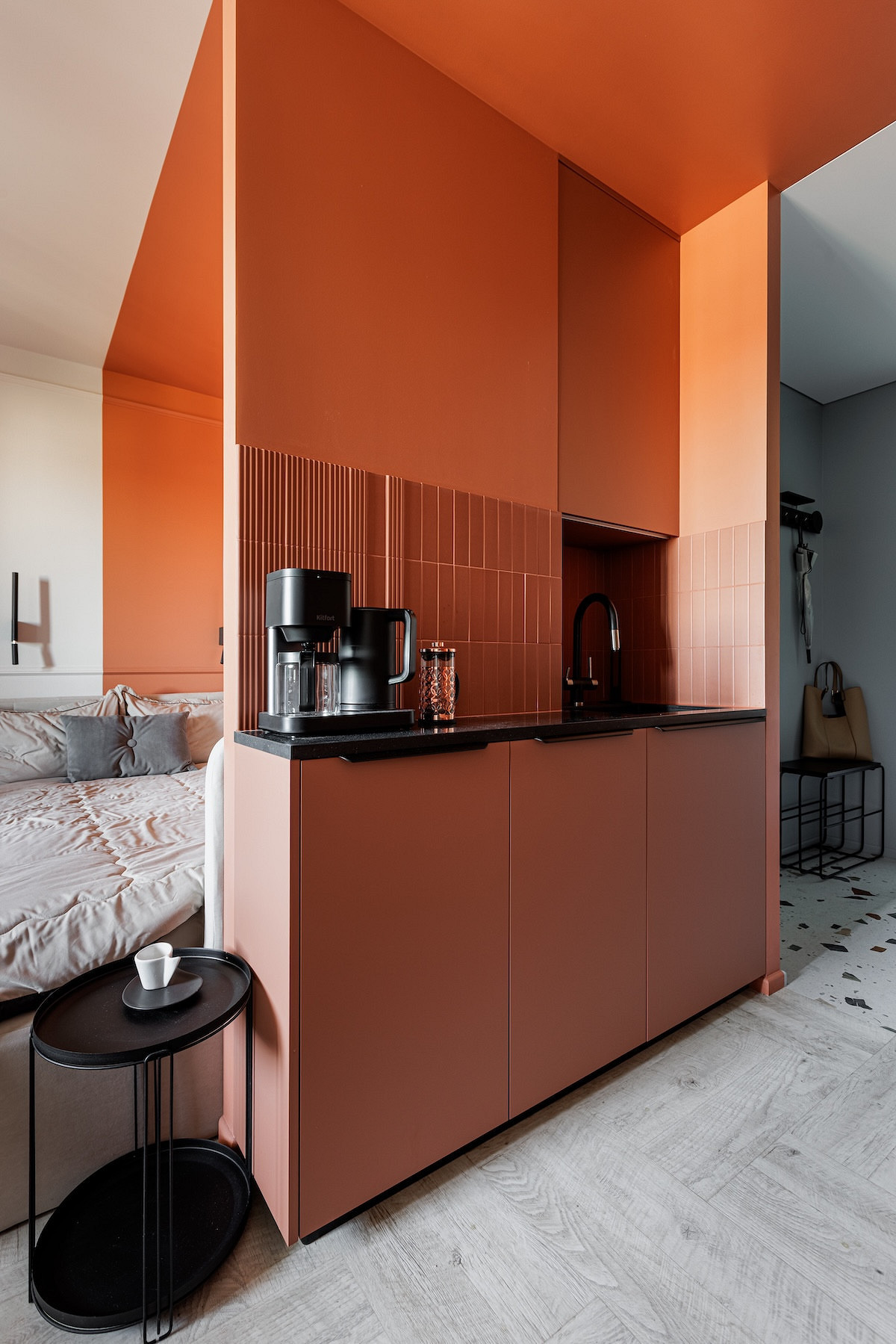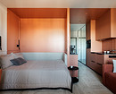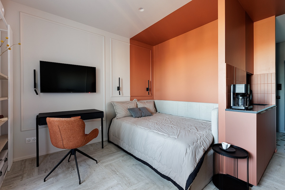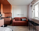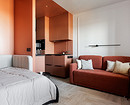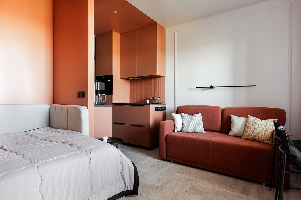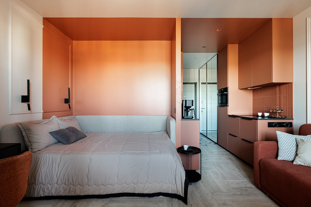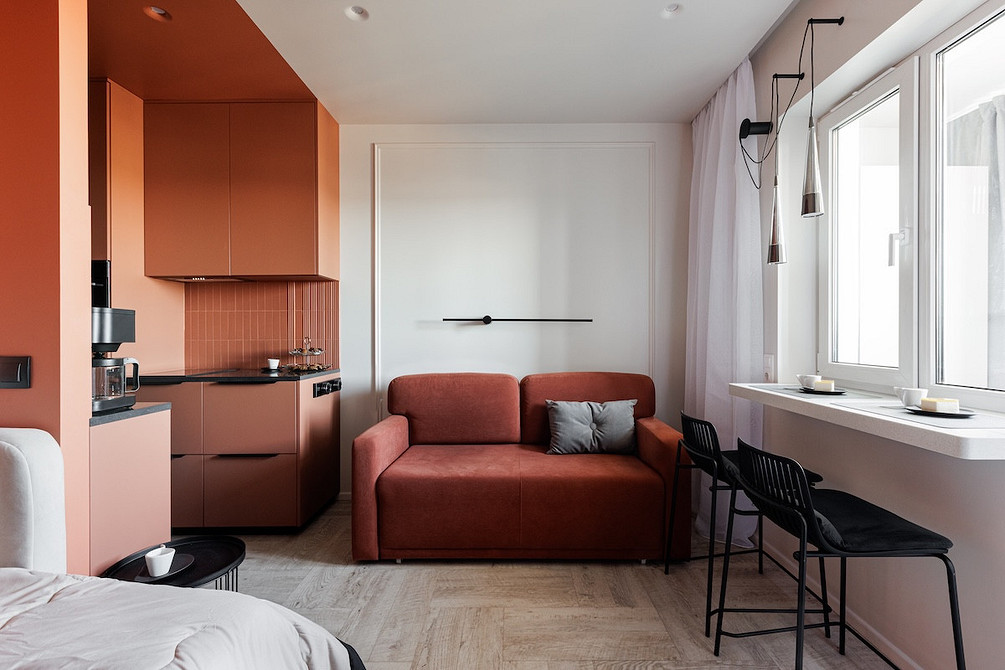 Терракотовой краской выделили кухню вместе с нишей, где спрятана кровать. Прием цветовых блоков работает безупречно: он структурирует пространство открытой планировки, не перегружая его перегородками. В паре с фоновым бежевым и прохладным голубым в прихожей терракот выглядит сочно, но благородно. Интерьер получился запоминающимся и уютным, идеальным для потенциального арендатора, который сможет оценить характер даже на маленькой площади.