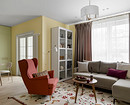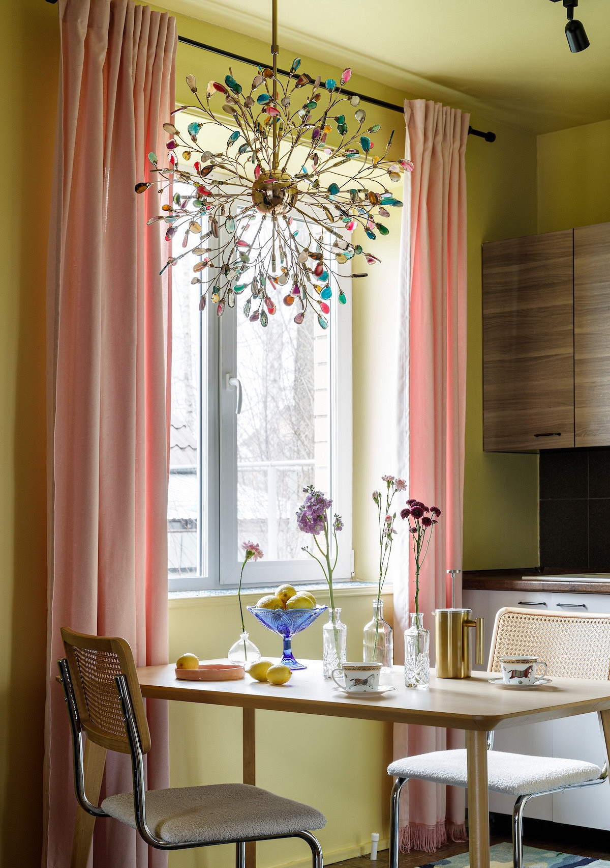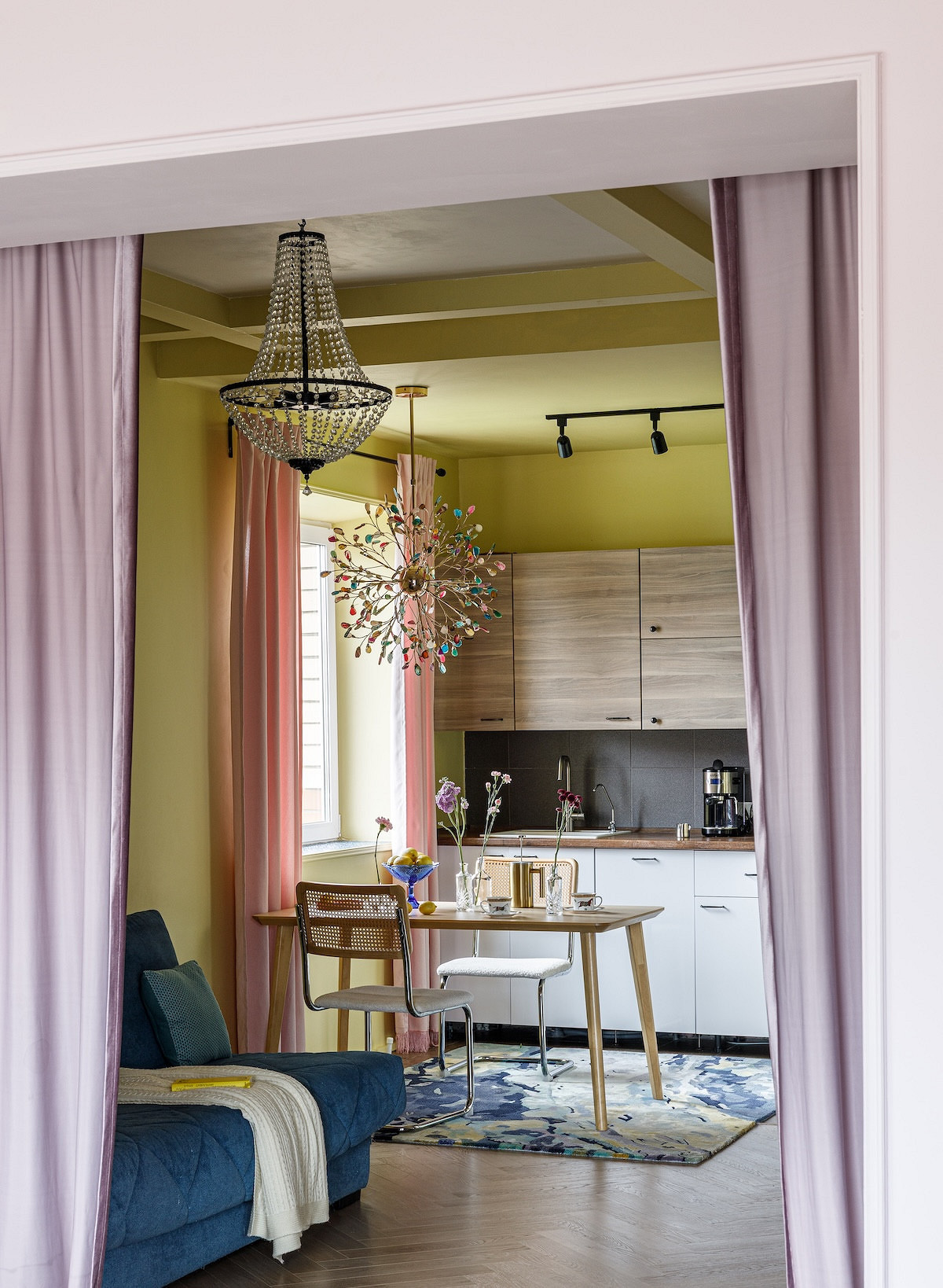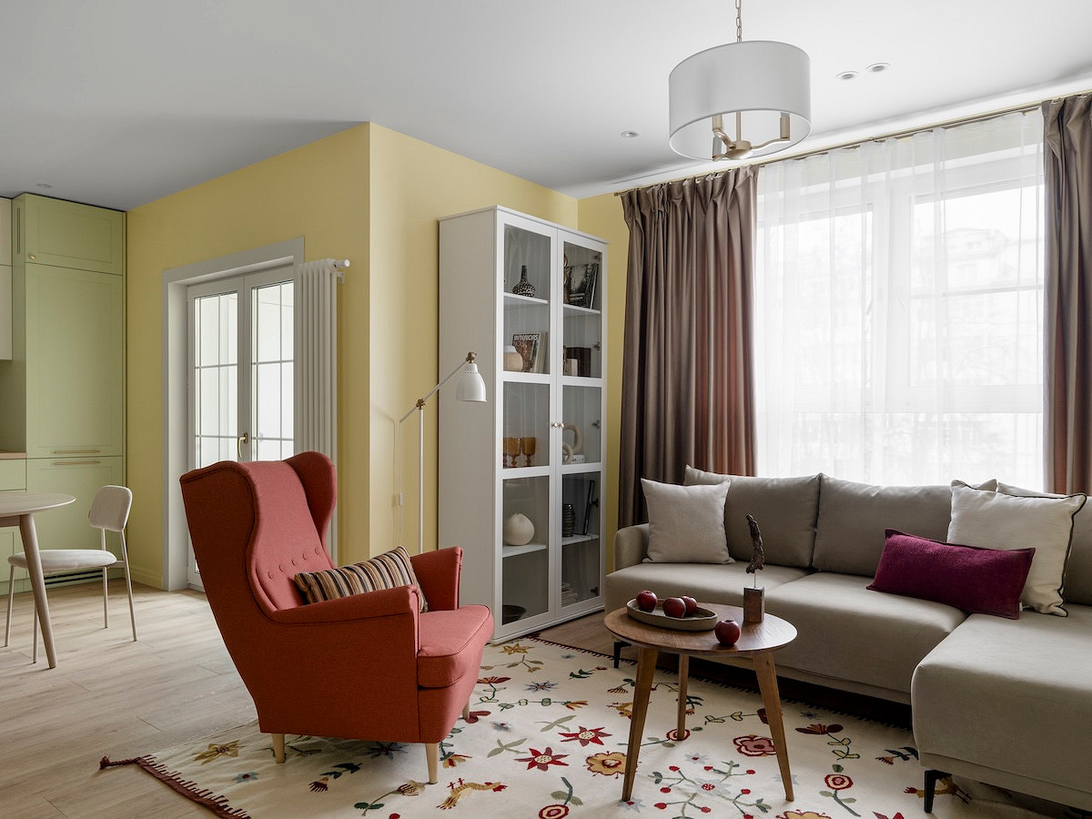 Для кухни-гостиной выбрали смелый лимонный цвет. Им покрыли не только стены, но и потолок, и балки, создав эффект теплого «кокона». Комната перестала казаться холодной и серой. При этом лимонный не утомляет — возможно, благодаря тому, что существующая мебель (голубой диван, деревянный стол, нейтральный кухонный гарнитур) уравновешивает его яркость. Интерьер получился по-настоящему авторским, отражающим характер хозяйки.