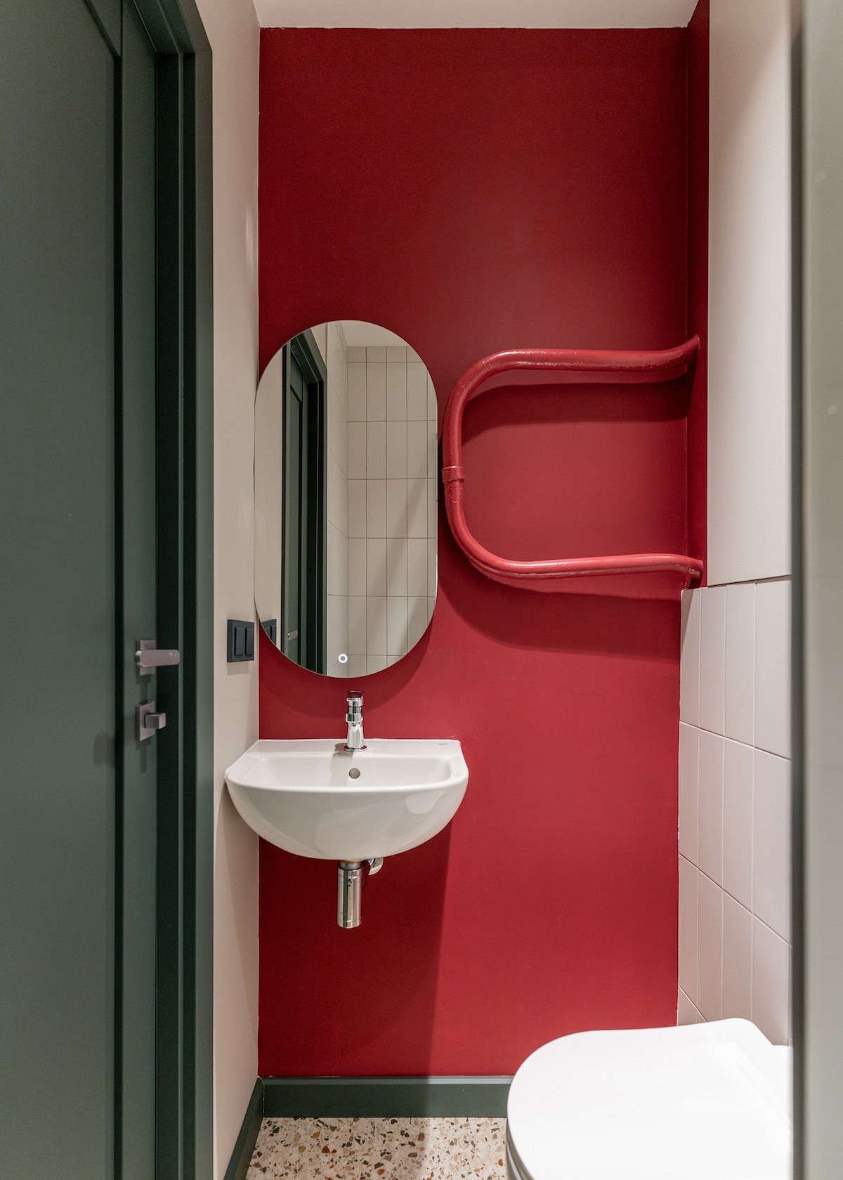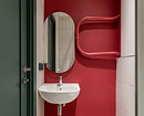 Старые чугунные радиаторы, стена на кухне с окном, стена за изголовьем кровати, а также стена в санузле — все это объединил яркий брусничный цвет. В паре с глубоким изумрудным (двери, плинтусы, розетки) он создал невероятно стильную и запоминающуюся графику. Это решение показало, что для смелого дизайна нужна не столько дорогая отделка, сколько смелость в выборе цвета.