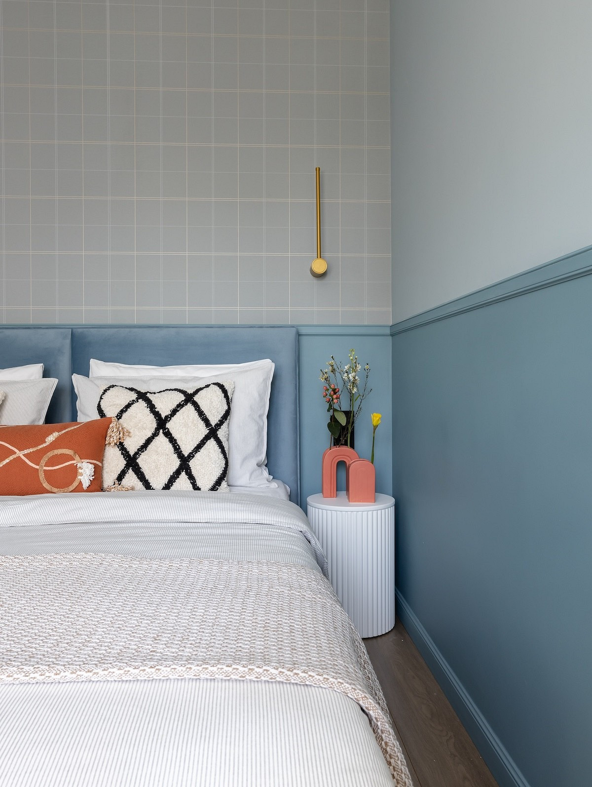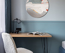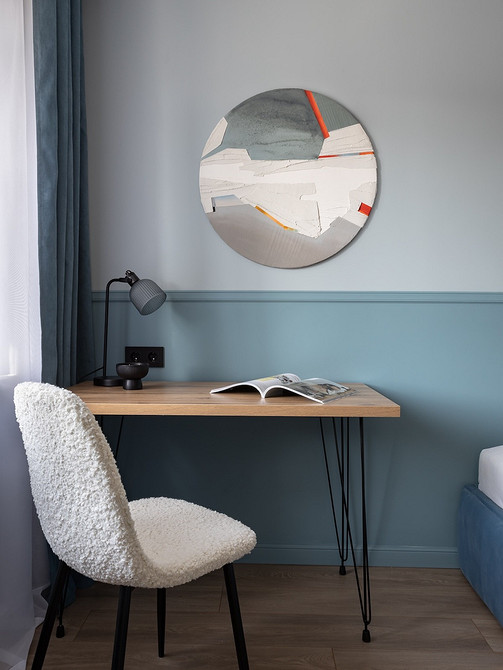 Стены окрасили в два оттенка голубого, разделив их горизонтальной линией с помощью молдинга. Этот классический прием «раздвинул» стены и сделал комнату пропорциональнее. Обои в клетку в тон на стене за изголовьем кровати поддержали лаконичность и не перегрузили маленькое пространство. В итоге спальня получилась не только функциональной (здесь поместился еще и рабочий стол), но и очень спокойной, атмосферной, с легким налетом классики.