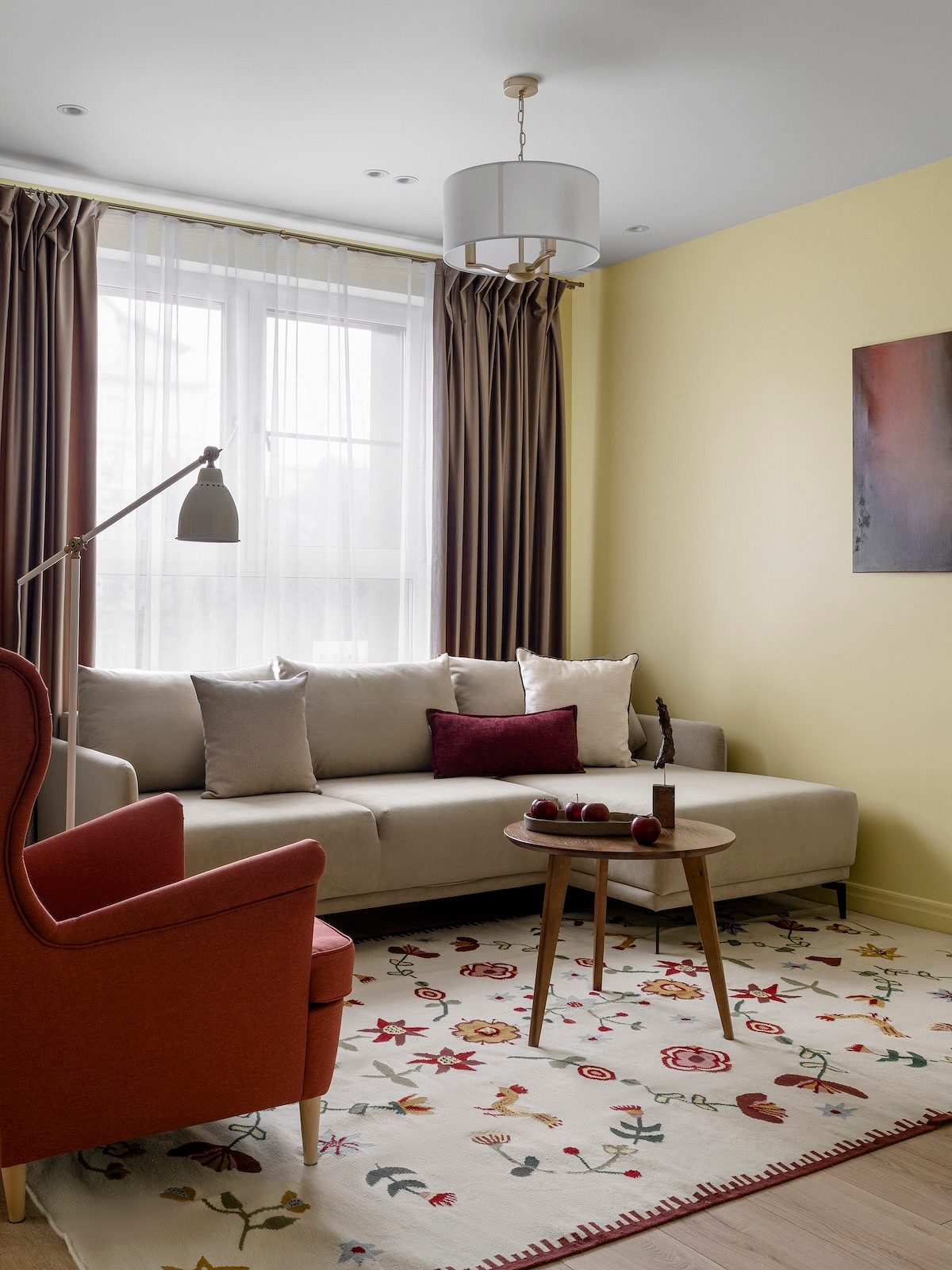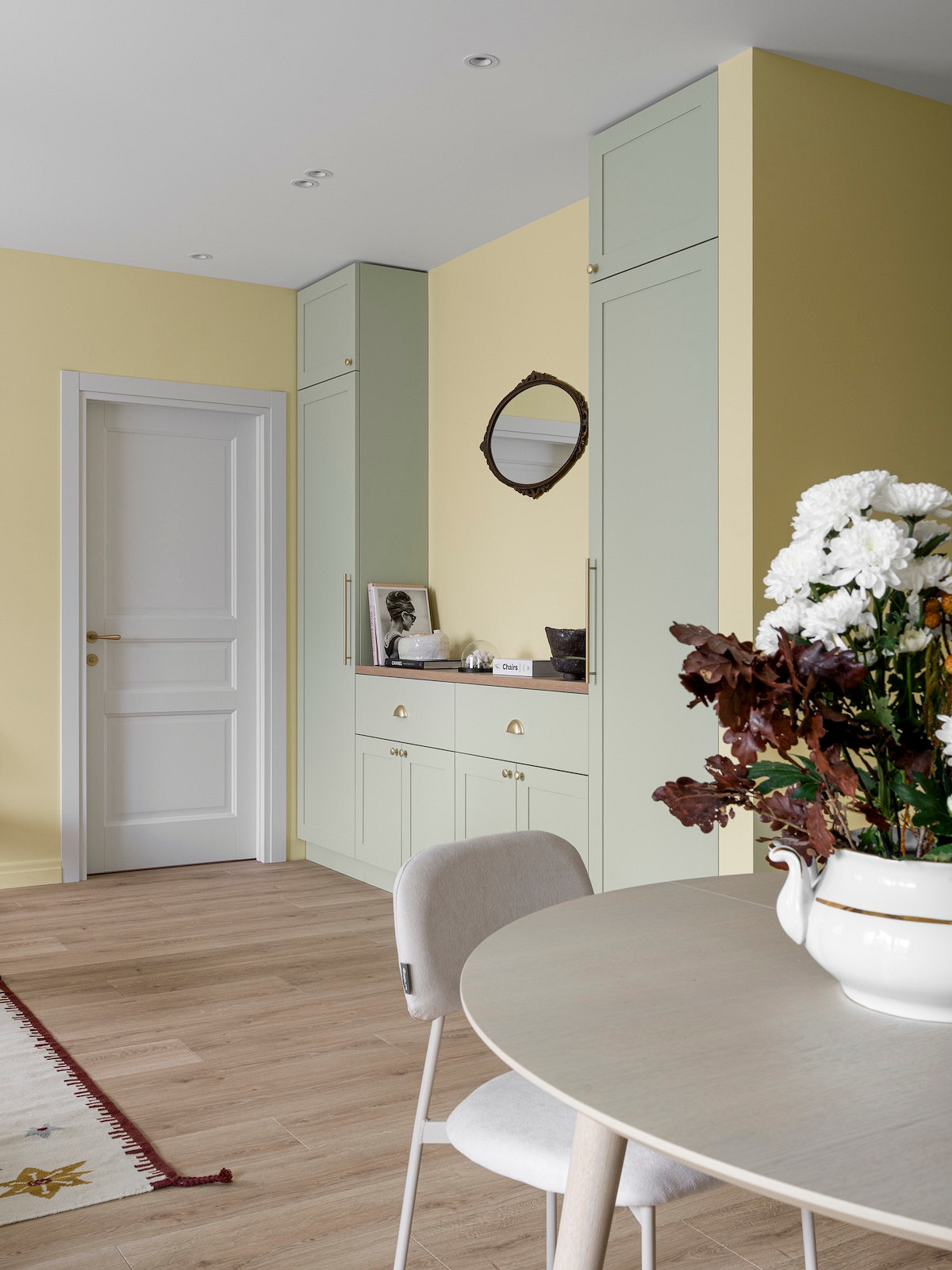 Стены в прихожей и кухне-гостиной покрасили в пастельный желтый оттенок. Он мягко отражает свет, наполняя комнаты солнечным сиянием даже в пасмурный день. Этот цвет создает то самое ощущение тепла и заботы, которое было главным запросом заказчицы.