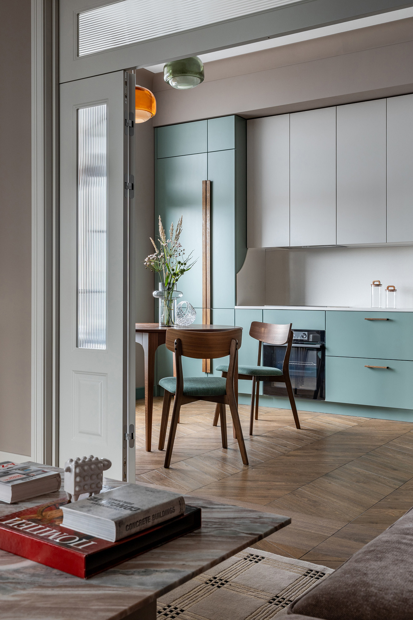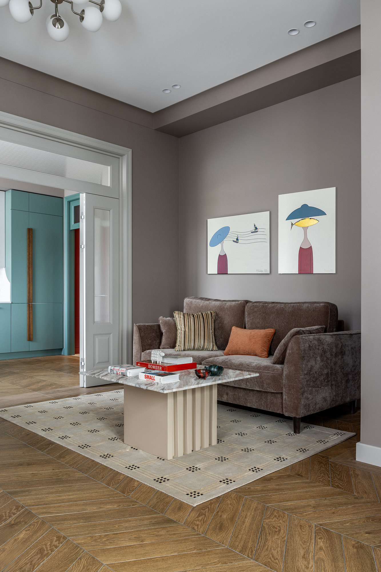 Этот сложный коричнево-серый тон с бархатистой глубиной стал идеальным фоном. Трюфель задает интерьеру благородное настроение. Он работает в паре с четкой геометрией пространства и высокими двойными дверями, подчеркивая архитектурность и элегантность современного интерьера.