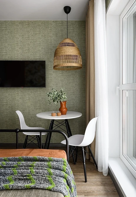 С ним эффектно будут смотреться любые оттенки зелени: от темных до светлых. С изумрудным получится яркий и контрастный тандем. С фисташковым и мятным — нежный, легкий и воздушный. В сочетании с такими стенами хорошо будет выглядеть белый пол, белая мебель, декор и даже текстиль.
