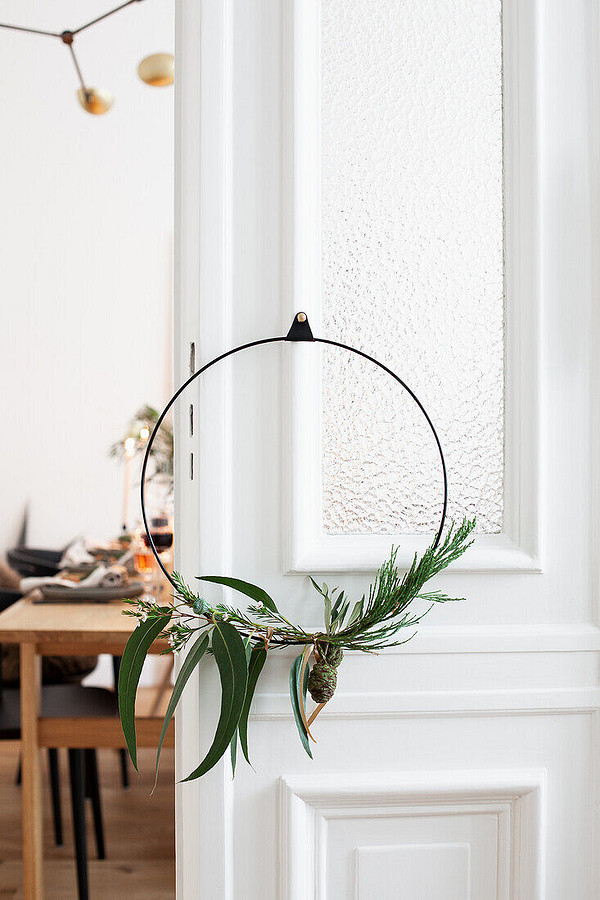 Дизайнерские интерьеры отличает внимание к деталям. В том числе — в тематическом украшении дома. Так, профессионалы не забывают про межкомнатные двери. Их можно декорировать бархатными лентами, колокольчиками, веточками ели. Или — как на фото ниже — повесить легкий венок. Пусть он будет частично пустым, это смотрится современно и модно. При этом не будет ощущения перегруженности, особенно если украшаете не одну дверь, а несколько или вообще все.
