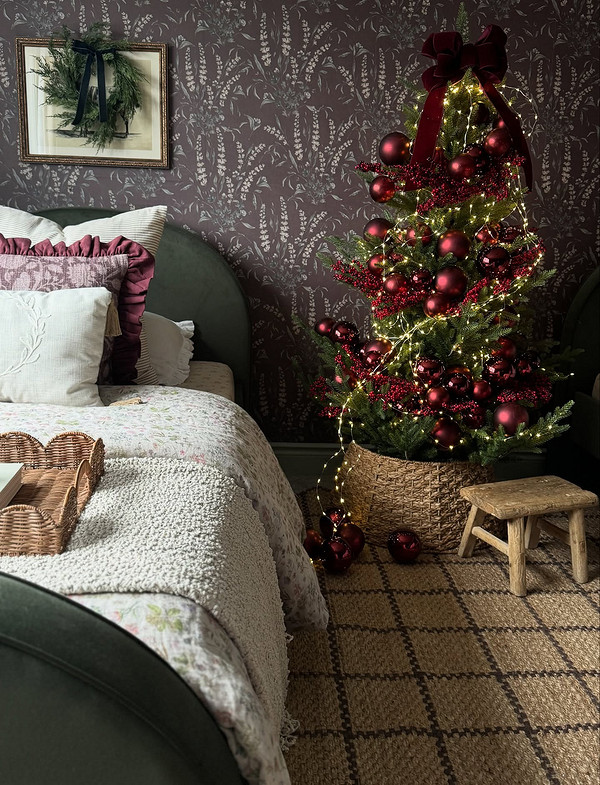 Популярный дизайнерский прием — оформить елку или весь интерьер в одном цвете. В зависимости от оттенка декор может смотреться минималистично, контрастно или торжественно. В примере на фото дизайнер нарядила елку в своей спальне в бордовые игрушки и дополнила искусственными ягодами и бантом-верхушкой в тех же тонах. Несмотря на темный цвет, украшения не теряются благодаря контрасту с зеленью елки и мерцающей гирляндой.
