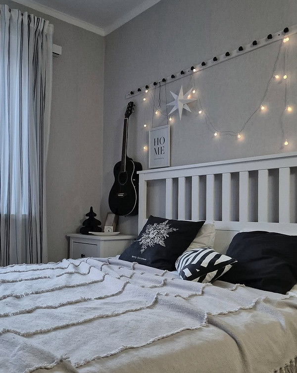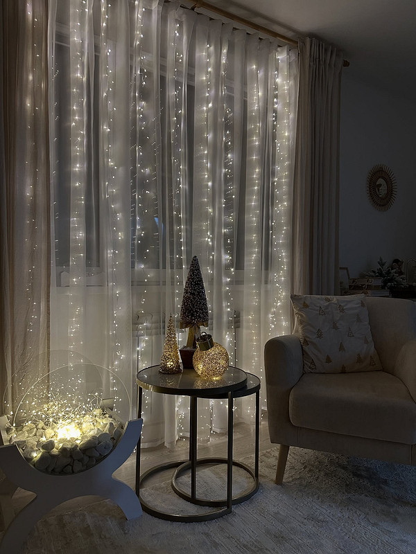 Переливающиеся огоньки — самый простой способ создать новогоднюю атмосферу в доме. Гирлянды можно развесить не только на елке, но и на окнах, шторах, под полками или по периметру потолка. Мягкий рассеянный свет сделает комнату уютнее, при этом подвесы занимают минимум места. Чтобы усилить эффект, поставьте пару настоящих или светодиодных свечей.