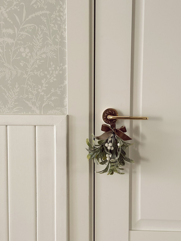 Маленькую квартиру важно не перегружать крупным декором, особенно если он яркий. Оставьте 1-2 главных украшения (например, елку и хвойную гирлянду в одной из комнат) и сосредоточьтесь на деталях. Даже если они не бросаются в глаза, все равно создают праздничную атмосферу. Например, можно декорировать дверные ручки, как в этом примере. Просто, бюджетно, можно сделать своими руками. При этом так красиво!