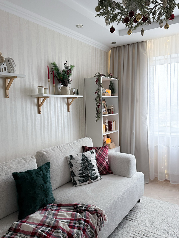 Одного только пледа или пары подушек с зимними мотивами достаточно, чтобы создать в интерьере новогоднее настроение. Текстиль не крадет полезную площадь: мебель уже стоит, не нужно ничего добавлять в комнату. Выбирайте изделия в традиционных праздничных цветах или подходящих под палитру конкретного интерьера, но, например, с лаконичным тематическим узором.