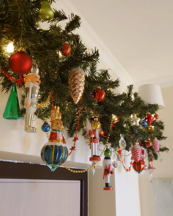 Продолжая тему вертикальных поверхностей, стоит уделить внимание входной двери. Нарядный проем с порога создает новогоднее настроение. Закрепите сверху еловую гирлянду, подвес с лампочками или композицию с колокольчиками и бантами. Такое оформление подходит для маленького помещения еще и потому, что декор находится выше уровня глаз и визуально не перегружает пространство.