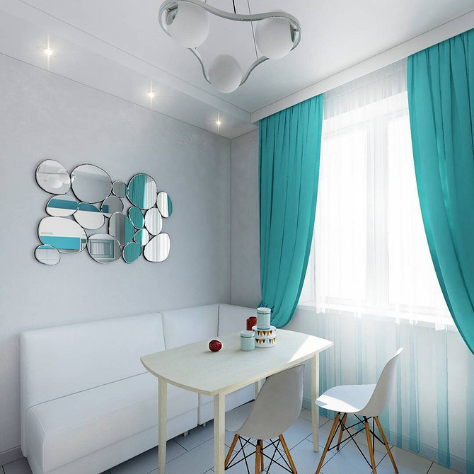 Бирюзовые шторы в интерьере гостиной, спальни, кухни и других комнат обычно подбираются к уже существующей палитре. Есть несколько оттенков, с которыми бирюза сочетается лучше всего.