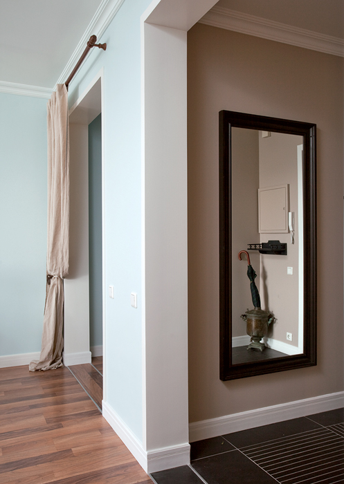Благодаря этому небольшая квартира выглядит как единое пространство. Серовато-голубой оттенок