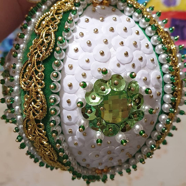 Это может быть классический елочный шарик или более сложная форма: например, животное, цифра или другая фигура. Пайетки — компактные по размеру, поэтому ими легче аккуратно обклеить детализированный силуэт, чем более крупными и «неповоротливыми» пуговицами. Кроме того, с помощью пайеток несложно самостоятельно создать красивые узоры, если расположить их по цветам определенным образом.