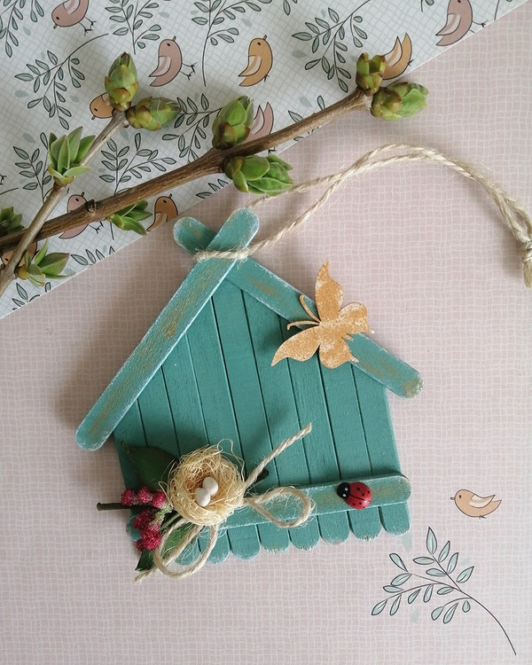 Очень интересно выглядит домик с округлой крышей. Его можно собрать из втулки и картона и раскрасить красками. Также попробуйте разрезать основание на тонкие кольца. Из них получатся красивые звезды или другие узорчатые фигуры. Достаточно просто склеить детали между собой, выкрасить в белый или любой другой подходящий цвет и дополнить декором: пайетками, блестками, бисером, перьями, ватой.