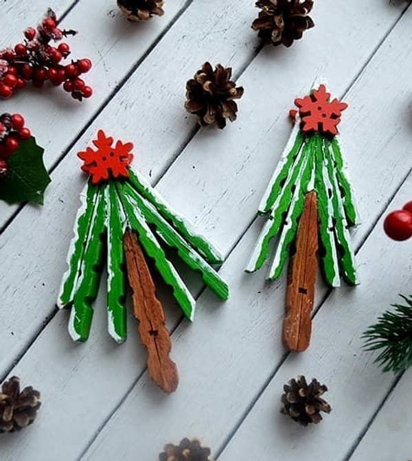 Из набора обычных бельевых прищепок можно сделать целый комплект новогодних игрушек.