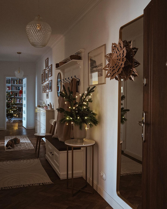 Подобная стилизация подойдет для дополнительного декора жилья, но если вы не фанат традиционных новогодних елок, то можно и вообще заменить ее на что-то более лаконичное и абстрактное.