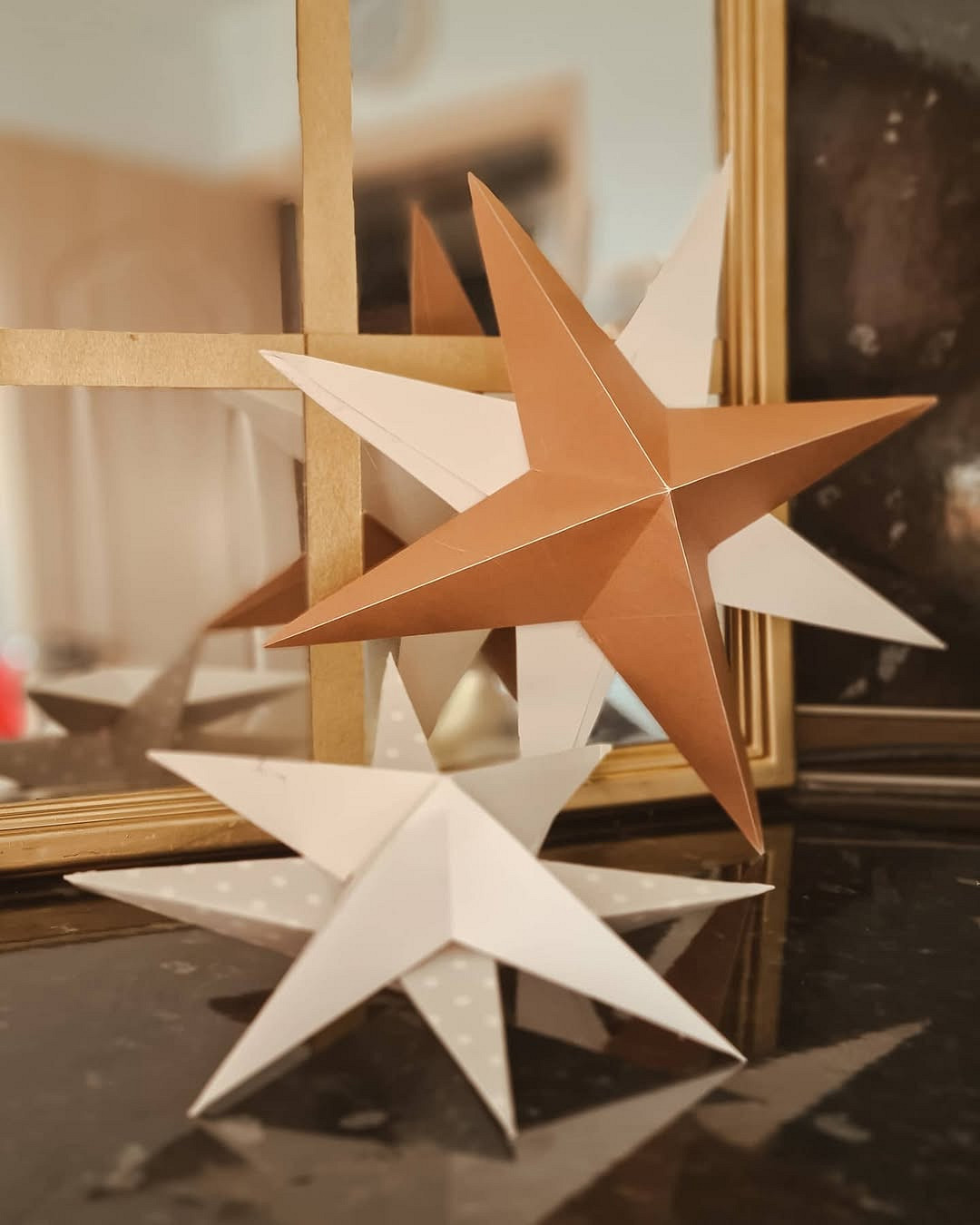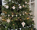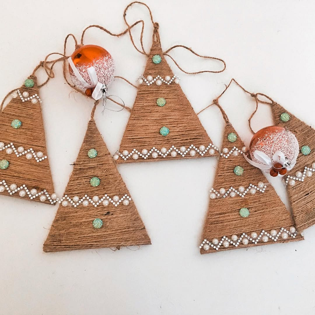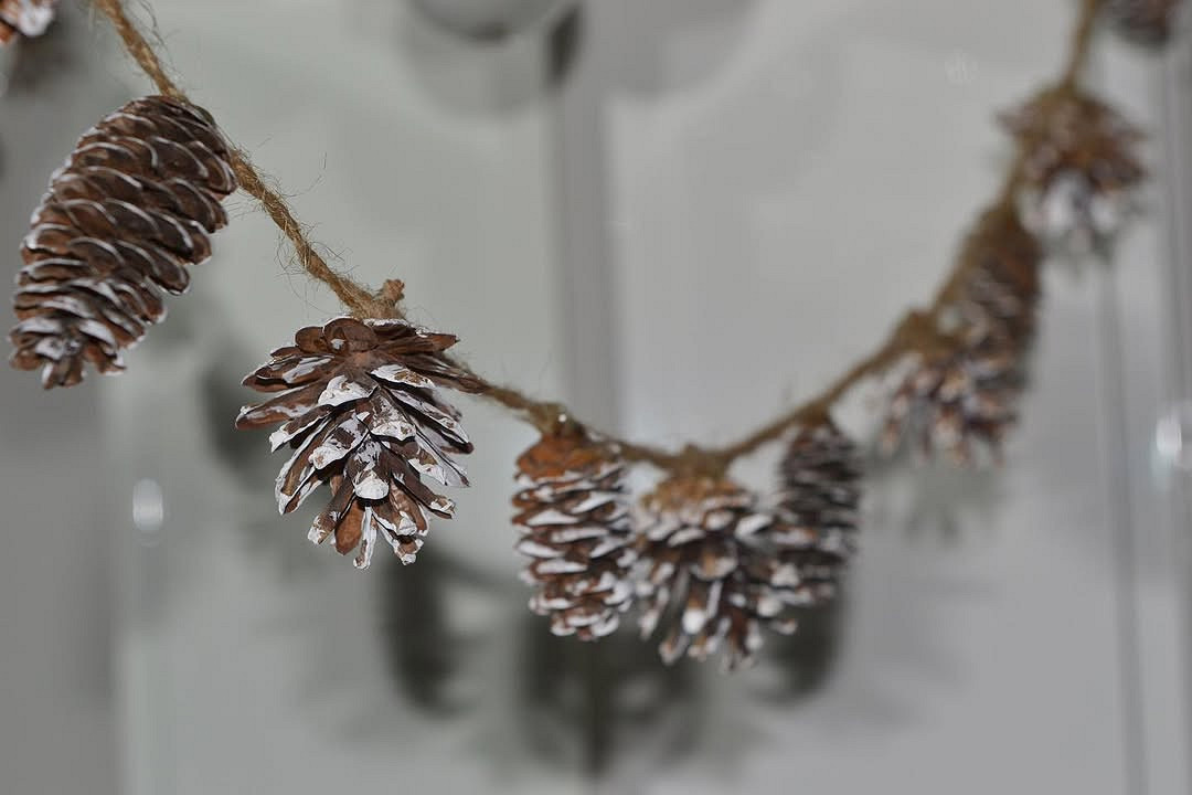 Покрасьте их в нарядные цвета — серебряный, золотой, белый и красный, и приклейте к тонкому шнуру через равные промежутки. Такой подвес уместен практически везде: на елке, на каминной полке, на стене, либо его можно подвесить на люстру или украсить окно.