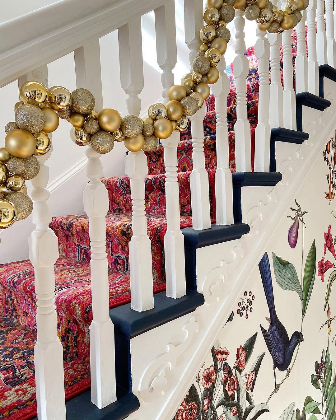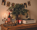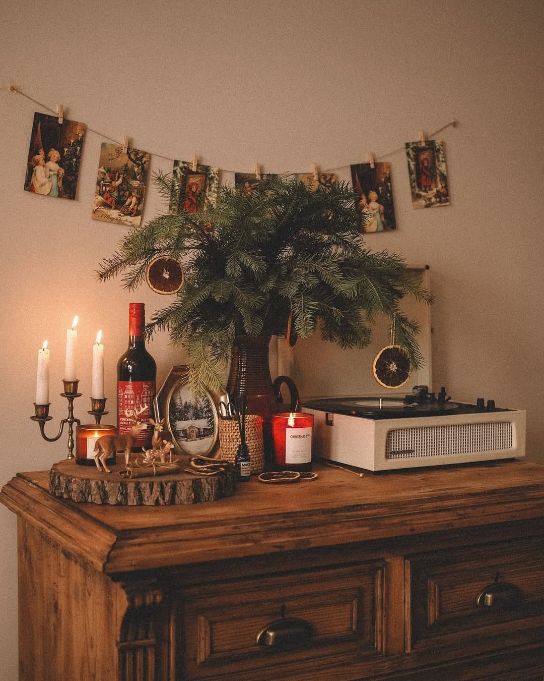 - Если у вас есть камин — настоящий или только имитация — его обязательно стоит задекорировать. Можно положить украшение на каминную полку, однако если речь идет о фальшкамине, то ленту с подвесами можно разместить и внутри его портала.