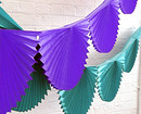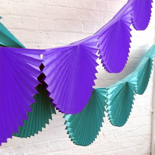 Очень красиво смотрятся гирлянды из вееров, а сделать их предельно просто: понадобится только двусторонняя цветная бумага и клей. Бумажный лист надо сложить гармошкой, а затем согнуть пополам и склеить в месте соединения. Получится полукруг. Сделав несколько таких заготовок, склейте их по краям — получится яркий и крупный декор, который хорошо смотрится на пустой стене или на окне.