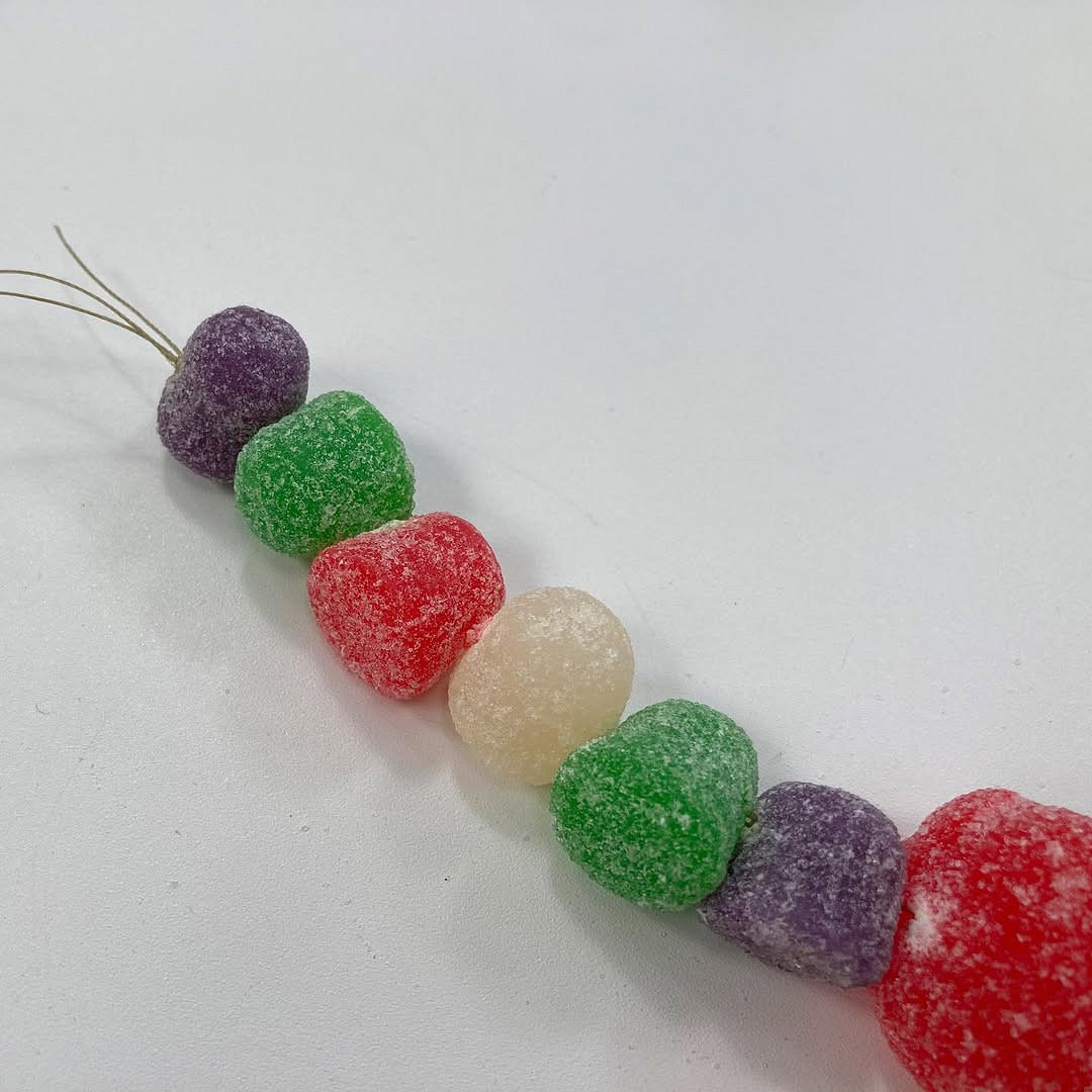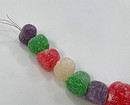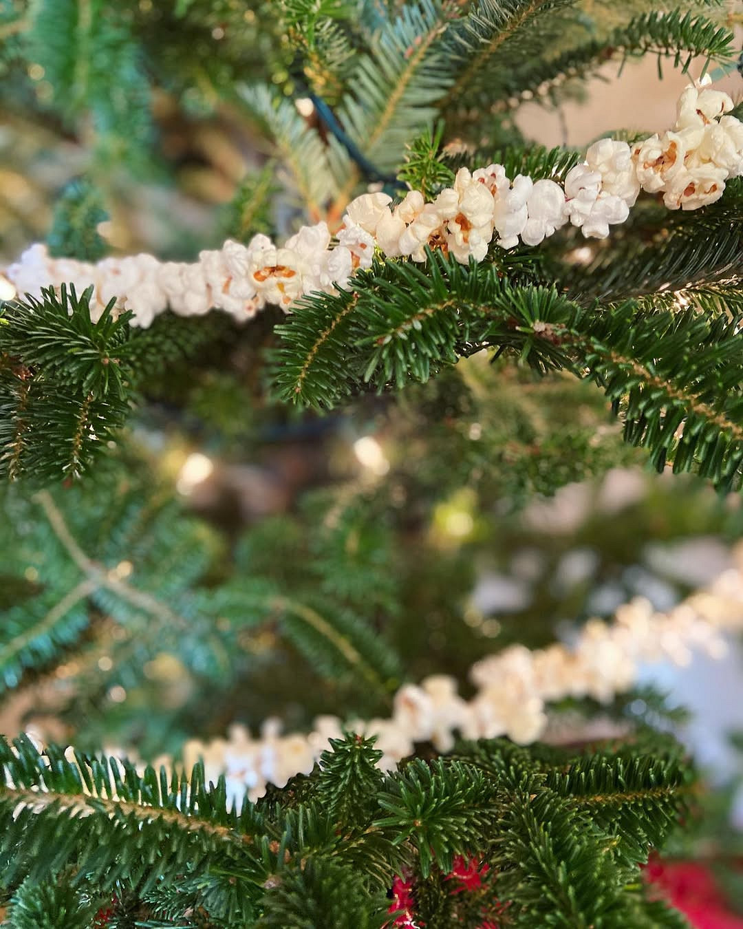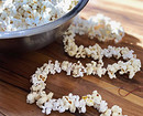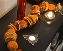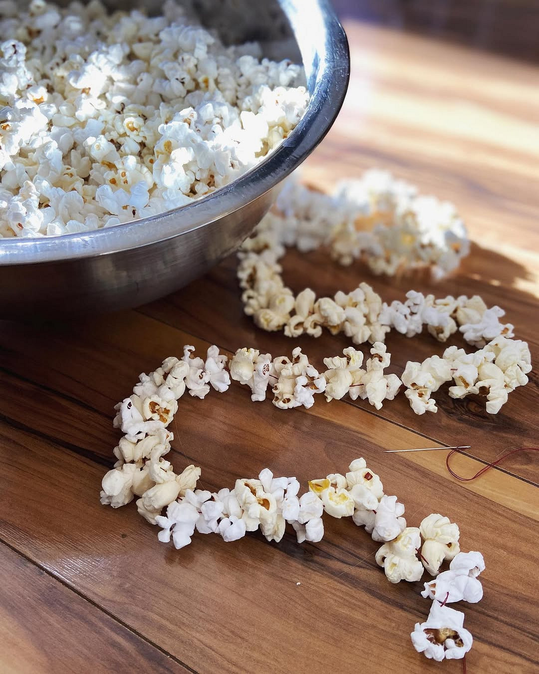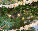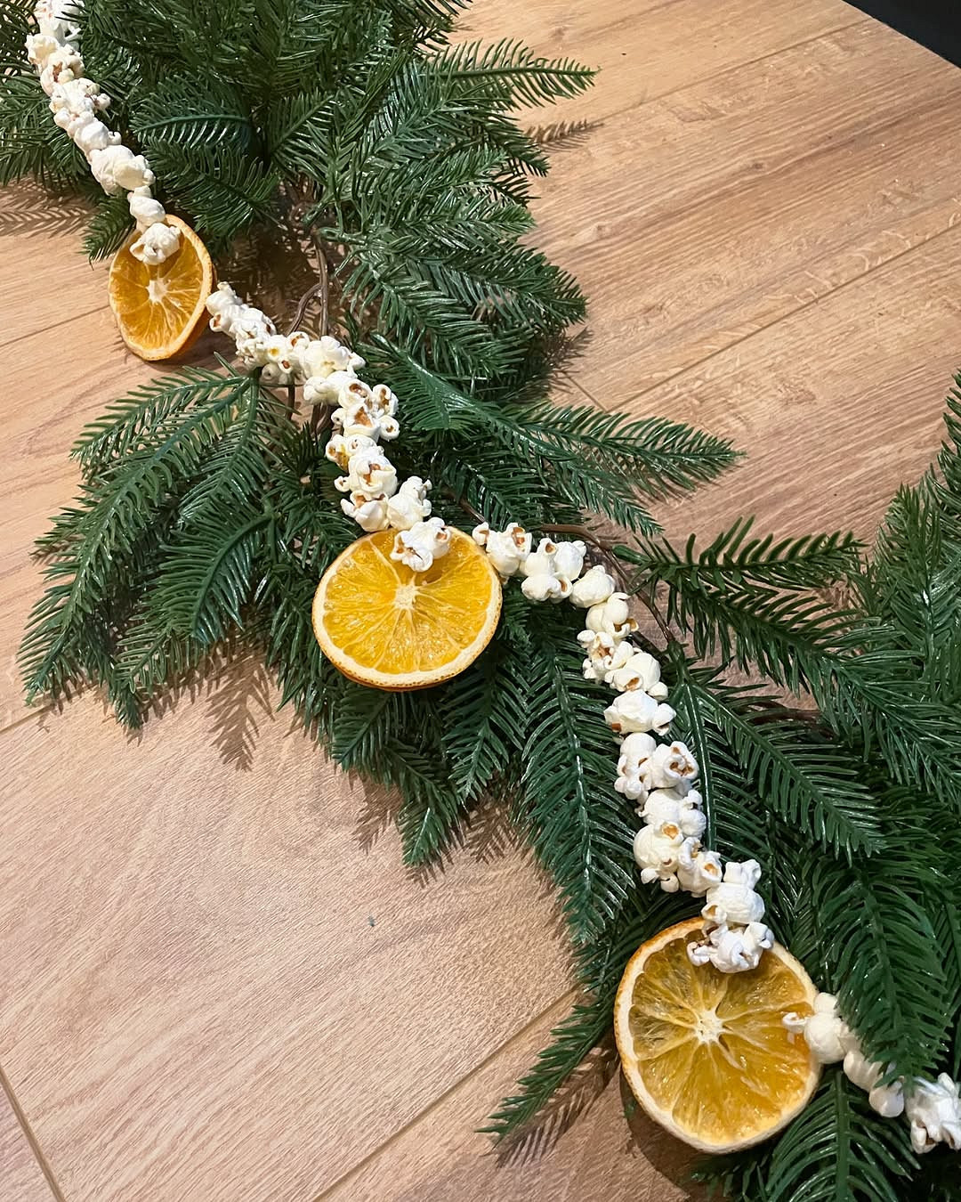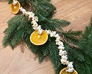 - Через тонкие и легкие элементы (например, апельсиновые кружки, безе, попкорн или цукаты) продевают иголку с ниткой, соединяя их в гирлянду.