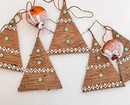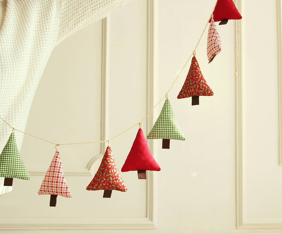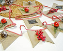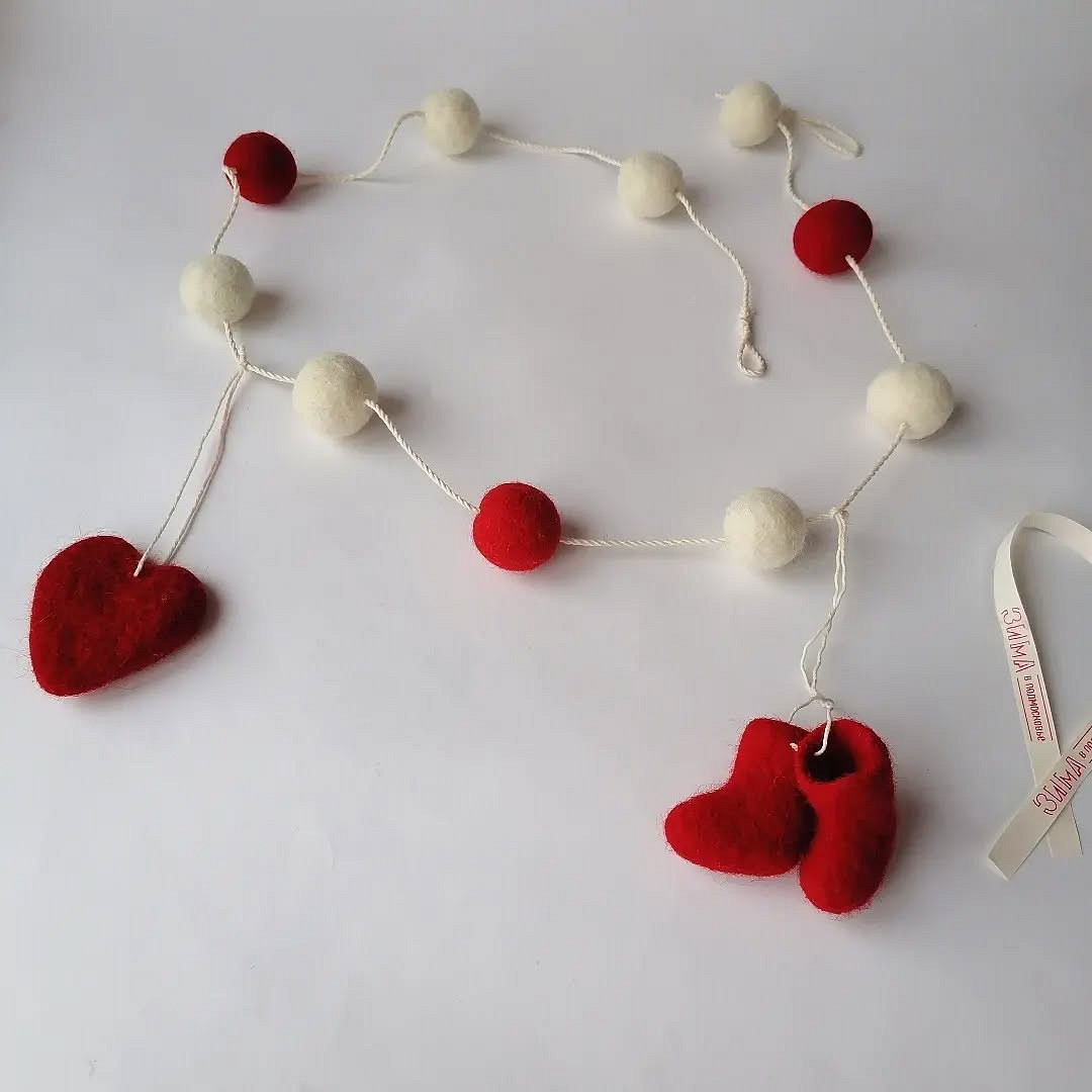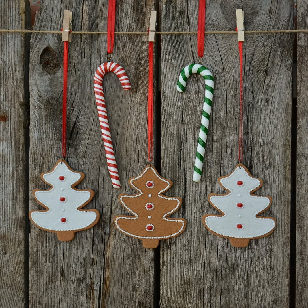 Проще всего делаются фетровые подвесы. Создать украшения из фетра можно так же, как сделать бумажную гирлянду на Новый год. Достаточно изготовить шаблон флажка, елочки или посоха-леденца на бумаге, обвести его на фетровой ткани и вырезать (этот материал не осыпается и хорошо держит форму, поэтому его не надо набивать или обрабатывать края), а затем приклеить термоклеем или зафиксировать степлером на ленте.
