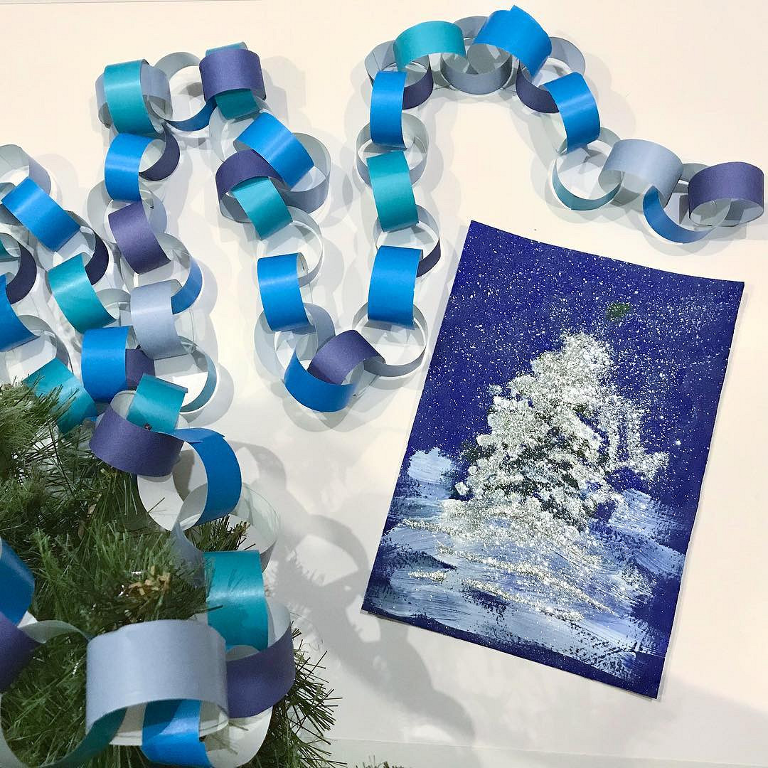 Еще один вариант, как сделать новогоднюю бумажную гирлянду, — склеить из тонких полос кольца и соединить их, получив таким образом красивый декор в виде цепочки. На изготовление этой поделки также не уйдет много времени: достаточно нарезать полосами шириной 2-3 см и длиной 20 см оберточную бумагу, а затем склеивать концы каждой детали (не забывая продеть в предыдущее кольцо), чтобы получился круг. Делать такие цепочки можно всей семьей, ведь с ними справится даже маленький ребенок.