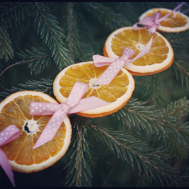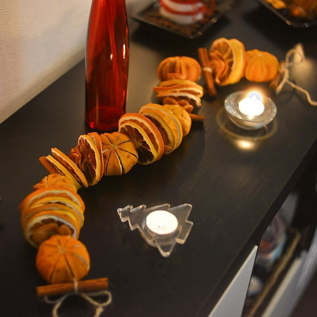 Одна из самых популярных и уютных идей праздничного оформления дома — использование для украшения мандаринов, кружочков сушеных апельсинов, позолоченных орехов, конфет, печенья и других вкусностей.