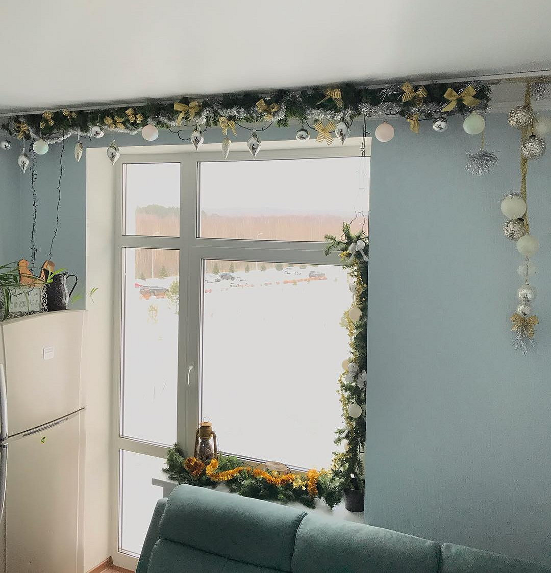 Наконец, можно привязать к нарядной ленте или к длинной пушистой мишуре елочные шары и игрушки, а затем подвесить ее на стене, окне или дверном косяке. А если новогоднего декора очень много, нанизайте его вплотную на прочную веревку или гибкую проволоку, чтоб получить объемное украшение.