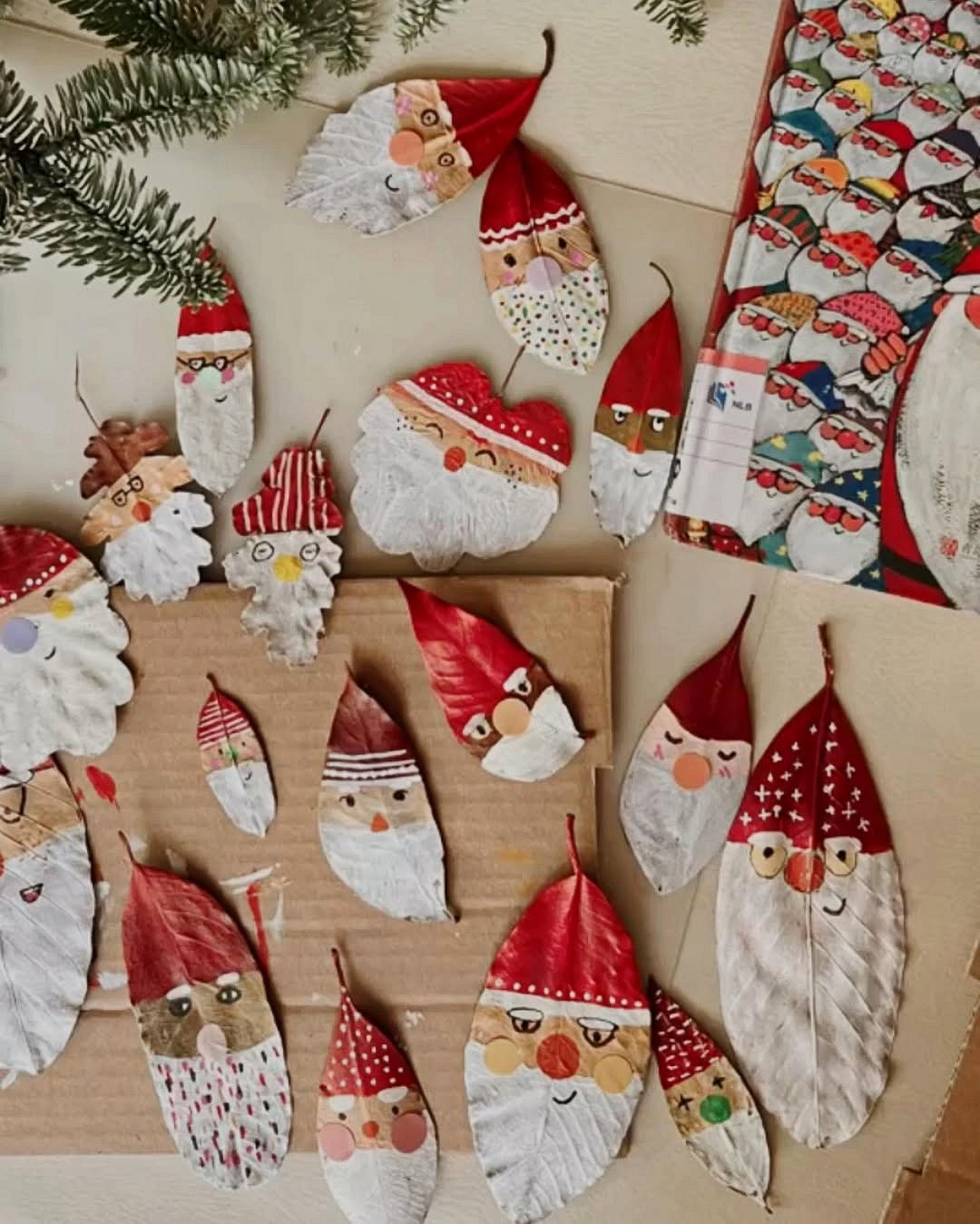 Необычную новогоднюю гирлянду можно сделать и из засушенных осенних листьев. Отберите продолговатые листочки и превратите их в Дедов Морозов, дорисовав бороды, глаза и шапки. Дальше останется только приклеить каждый элемент к ленте, чтобы получить оригинальный и веселый декор для елки или дома.