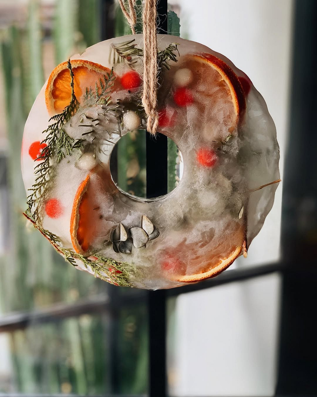 Для тех, кто отмечает Новый год за городом, можно посоветовать ледяную гирлянду: в формочки для льда залейте воду, подкрашенную пищевыми красителями (они продаются в магазинах для кондитеров), а сверху положить веревку и аккуратно заглубить в каждую ячейку. Затем поставьте формы в морозилку — через несколько часов уличный декор из цветного льда будет готов.