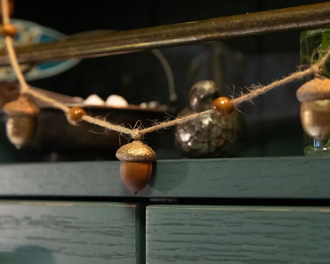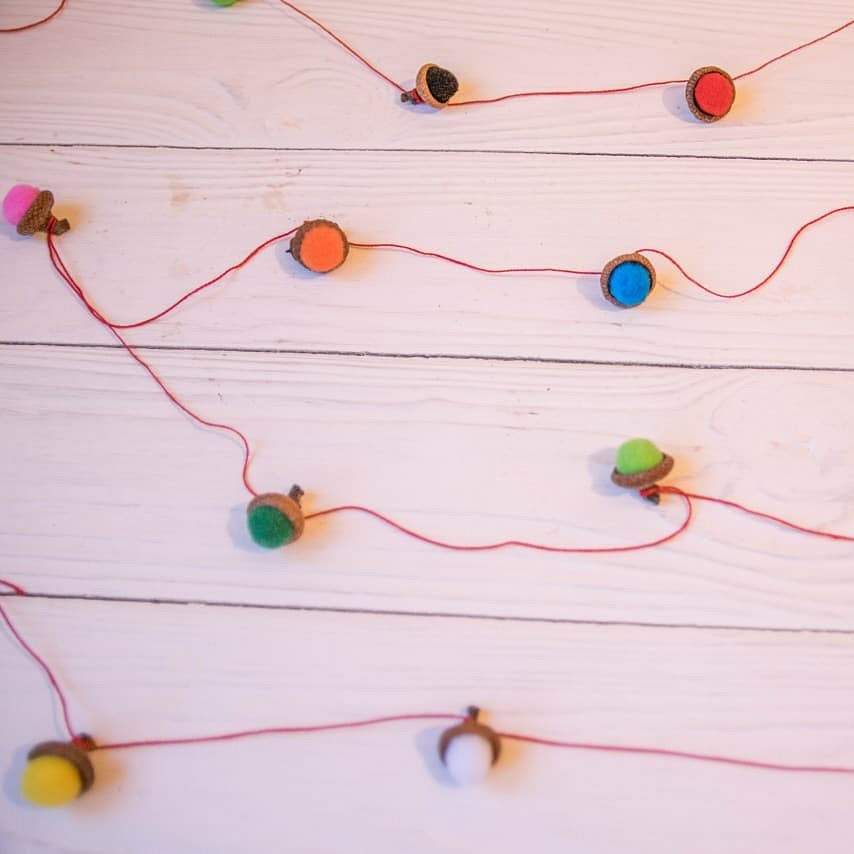 - Насобирайте шляпок от желудей и купите маленькие пушистые шарики или помпоны в магазине для хобби. Подготовьте также клей и веревку.