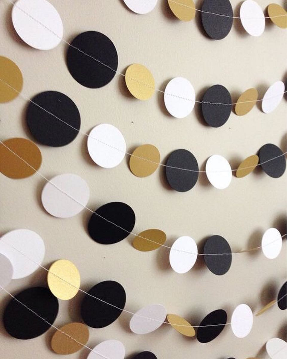 Также легко будет сделать гирлянду-конфетти, при этом выглядит она очень празднично, а за счет небольшого размера кружков она отлично подходит для оформления елки. Сперва надо вырезать много кругов — они могут быть одинаковыми или разными по размеру и цвету. Затем их приклеивают к длинным нитям. Чаще всего подобное украшение делают в виде бахромы, когда множество веревочек с конфетти привязывают на одну общую ленту на некотором расстоянии друг от друга.