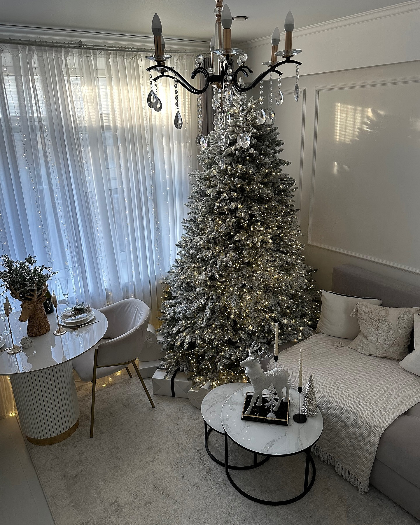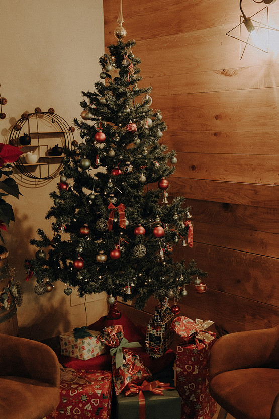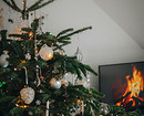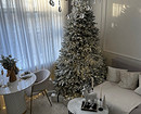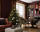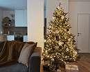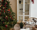 Елка — неизменно главный атрибут Нового года, хоть и не строго обязательный. Если вы ставите ее, подберите место, которое хорошо просматривается с порога комнаты, но при этом не должно быть препятствий для движения. Чаще всего дерево размещают в углу гостиной или по центру, если помещение большое. В маленьких квартирах ель можно заменить компактной настольной моделью или украшенными лентами и игрушками хвойными ветвями в вазе.