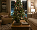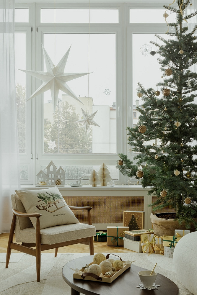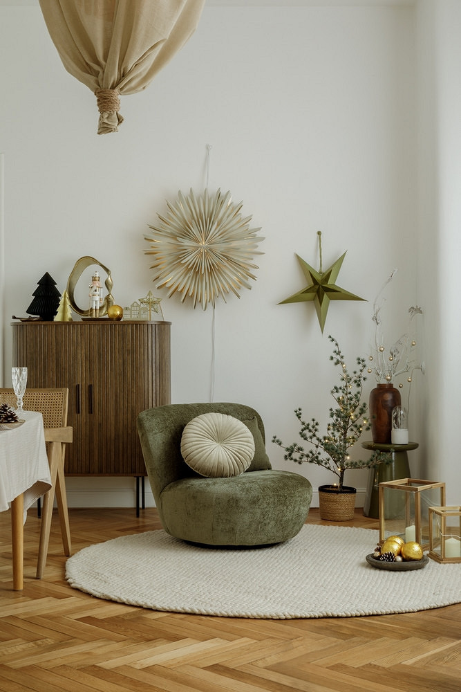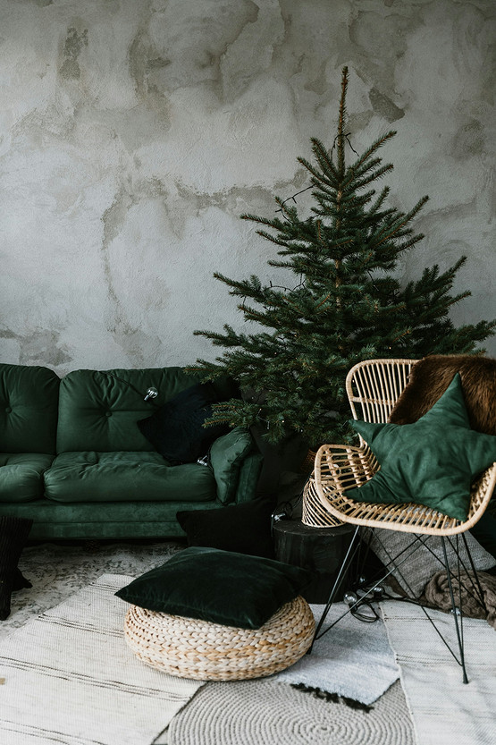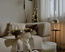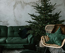 В комнате отдыха достаточно 2-3 новогодних элементов: пледа, пары свечей в стекле, хвойных или ягодных веток в вазе. Можно поставить небольшую елочку в корзине как дополнение к основной (или даже вместо, если квартира маленькая). Выбирайте для декора и текстиля сдержанные оттенки. К таким относятся молочный, песочный, карамельный, приглушенный зеленый.