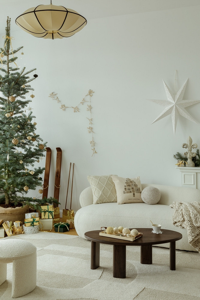 Чтобы декор не выглядел однообразным, особенно если интерьер не минималистичный, дизайнеры советуют добавить несколько цветовых акцентов: бордовый, кирпичный или другой оттенок красного, изумрудный или голубой. Они добавляют праздничного настроения, но не перетягивают все внимание. Также палитру стоит дополнить деталями молочного, серо-бежевого, дымчато-зеленого и графитового цвета. Они в меру спокойные, но в то же время могут выступать естественным контрастом.