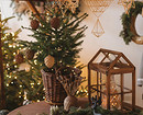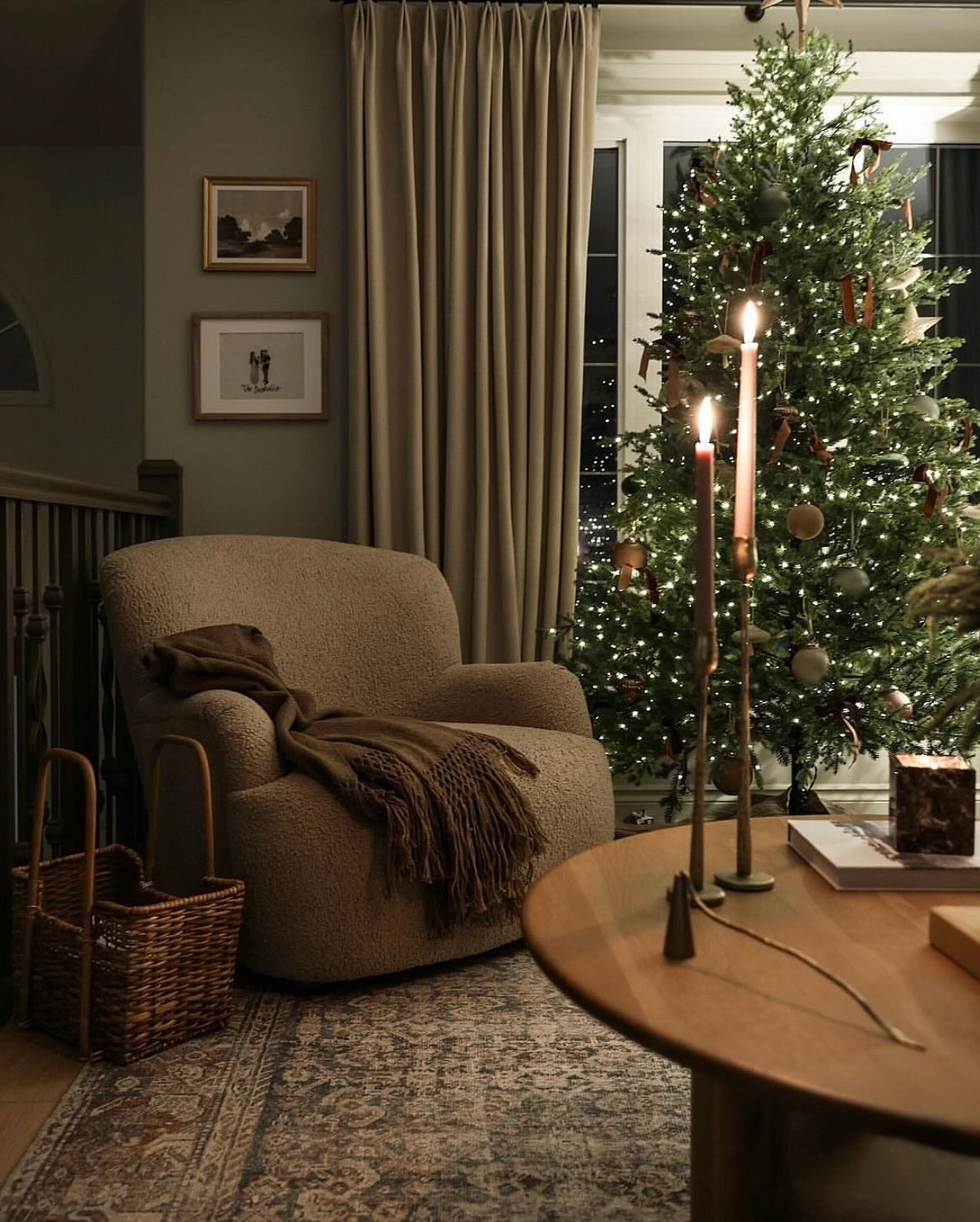 В приоритете оттенки, которые ассоциируются с природой и уютом: песок, глина, карамель, янтарь, охра и т.п. Эти цвета можно использовать как основу (для текстиля, крупных настенных украшений или елочных игрушек) либо в деталях: например, подобрать в спокойной гамме свечи, мелкие аксессуары, штучный декор елки. Теплые тона хорошо сочетаются с деревянными поверхностями, натуральным камнем, медью и латунью.