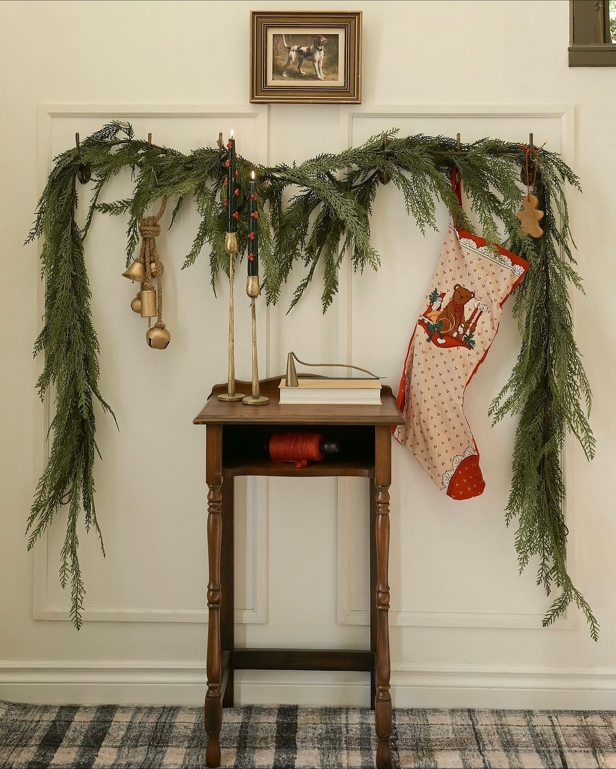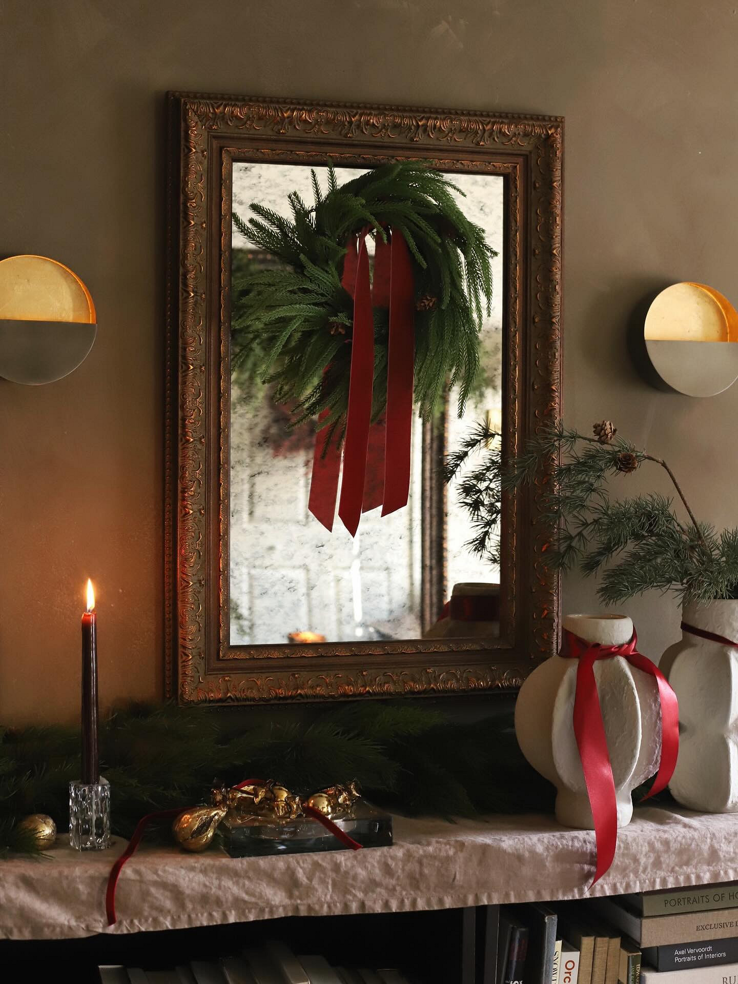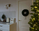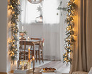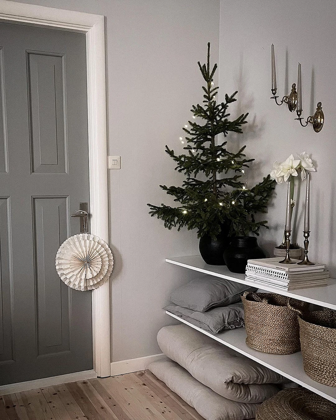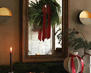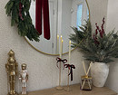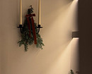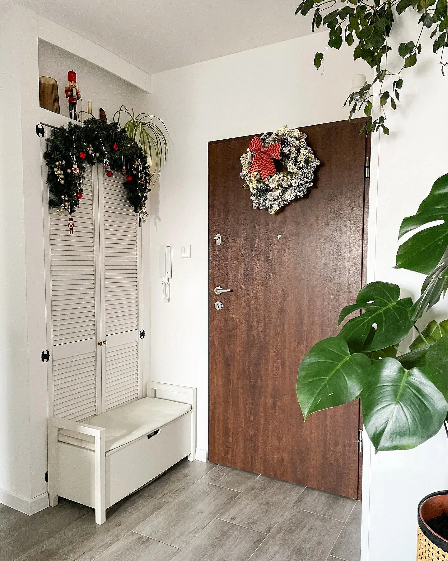 Прихожая задает тон всему интерьеру и формирует первое впечатление, поэтому ее тоже стоит украсить. Повесьте на входную дверь венок или пару колокольчиков на лентах, декорируйте зеркало гирляндой. Если на консоли или полках есть свободное место, можно поставить туда пару фигурок либо компактную вазу с лаконичным зимним букетом. Предметы не должны мешать движению и комфортным сборам. Если места слишком мало, лучше ограничиться подвесным декором.