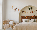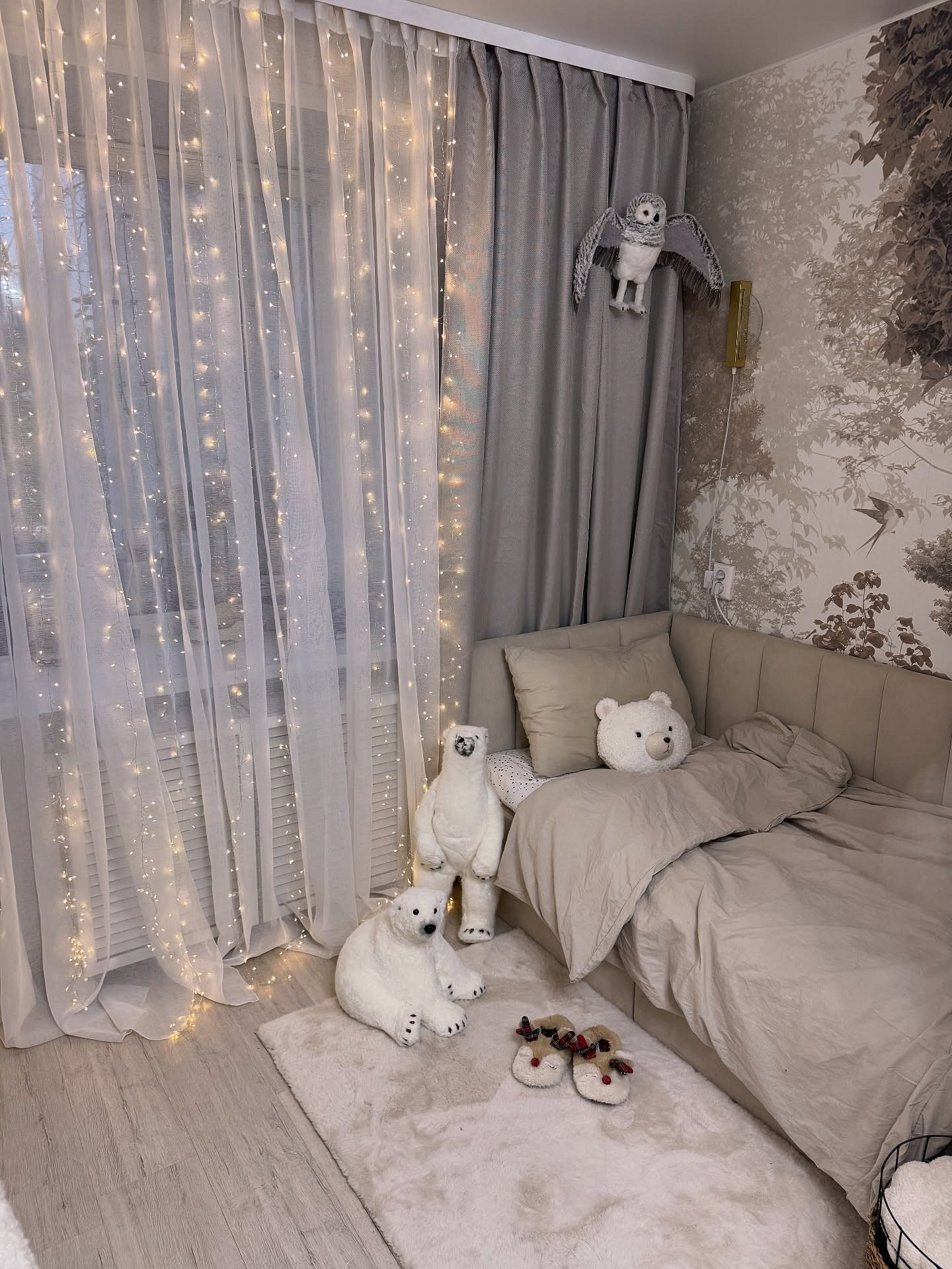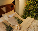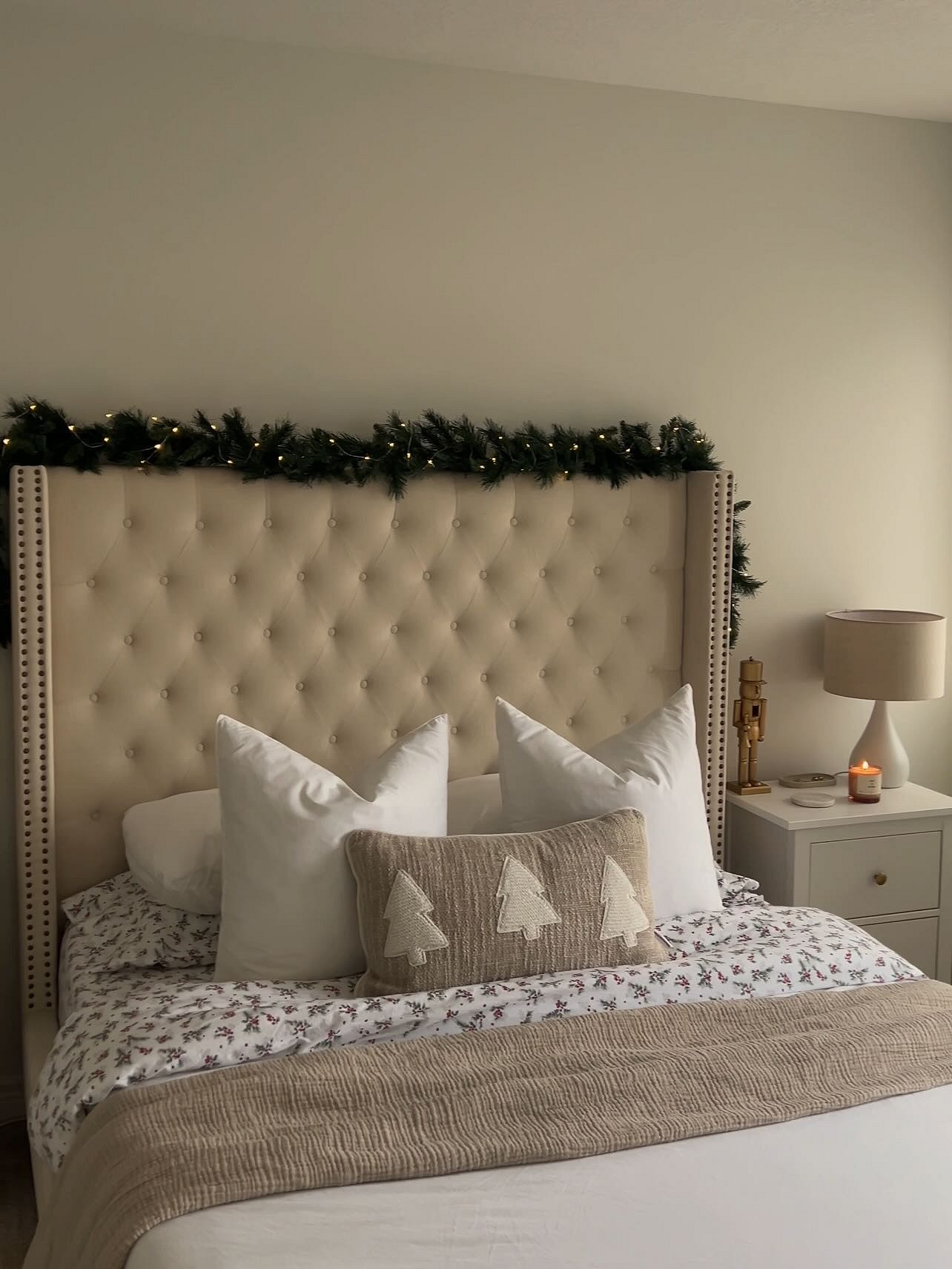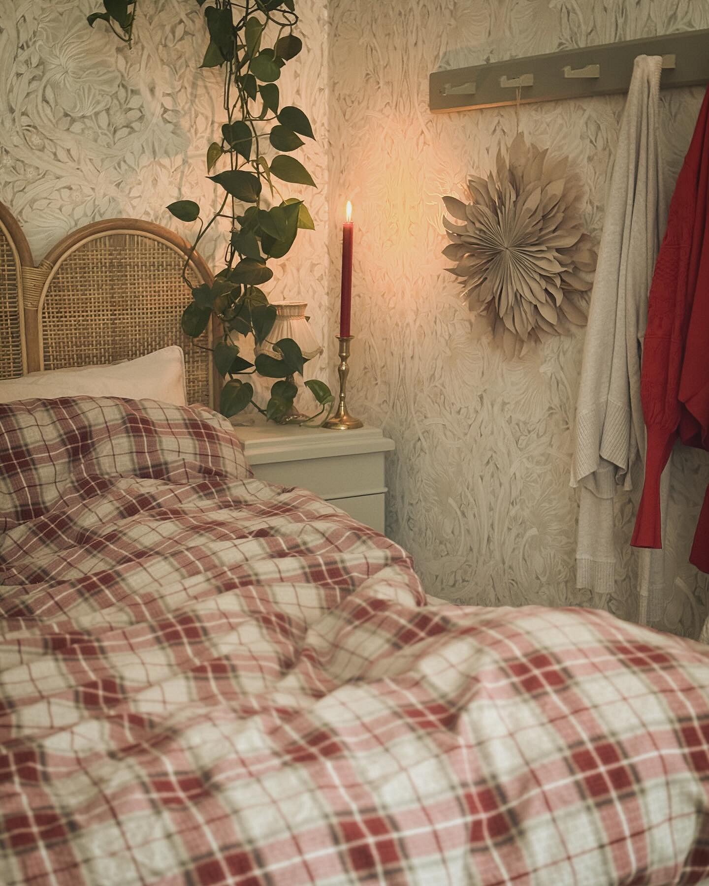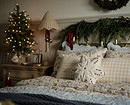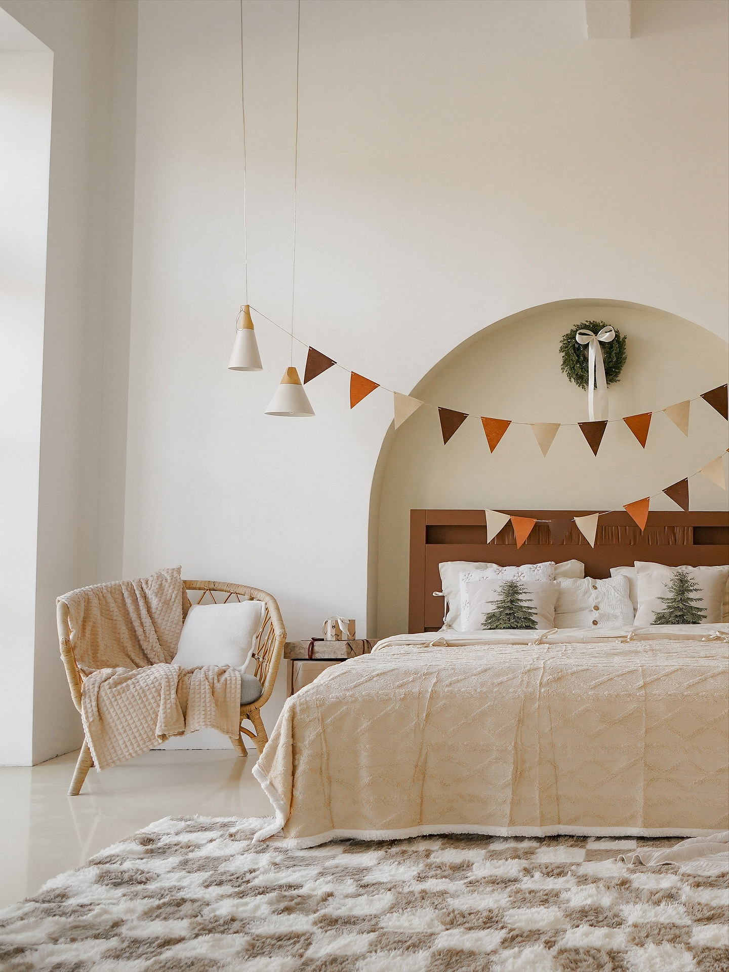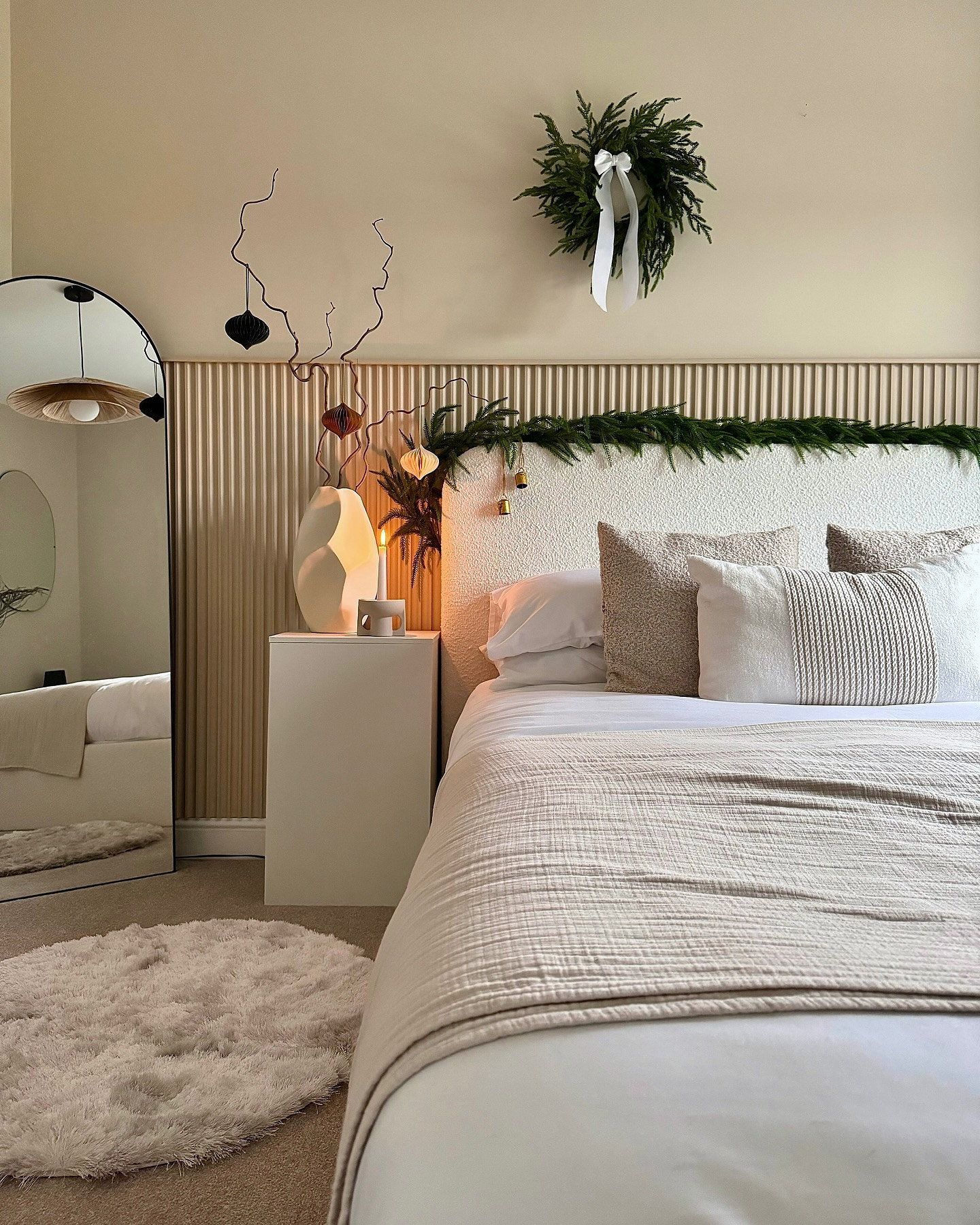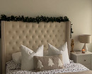 В изголовье кровати можно повесить электрическую или еловую гирлянду, выбрать тематическое постельное белье или текстиль в традиционных зимних цветах. Окна украсят бумажные звезды или свечи в колбах.