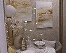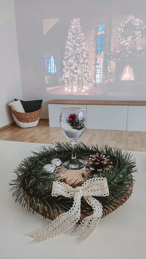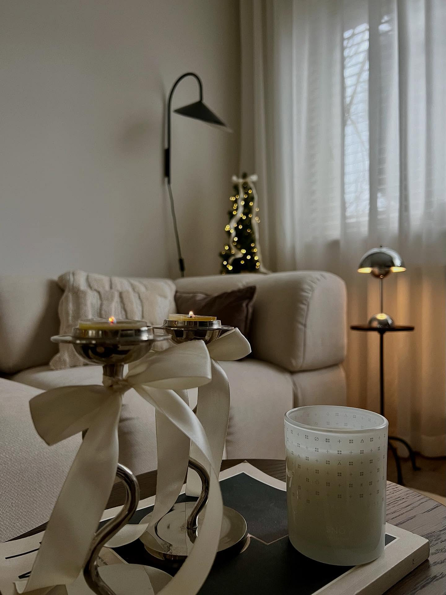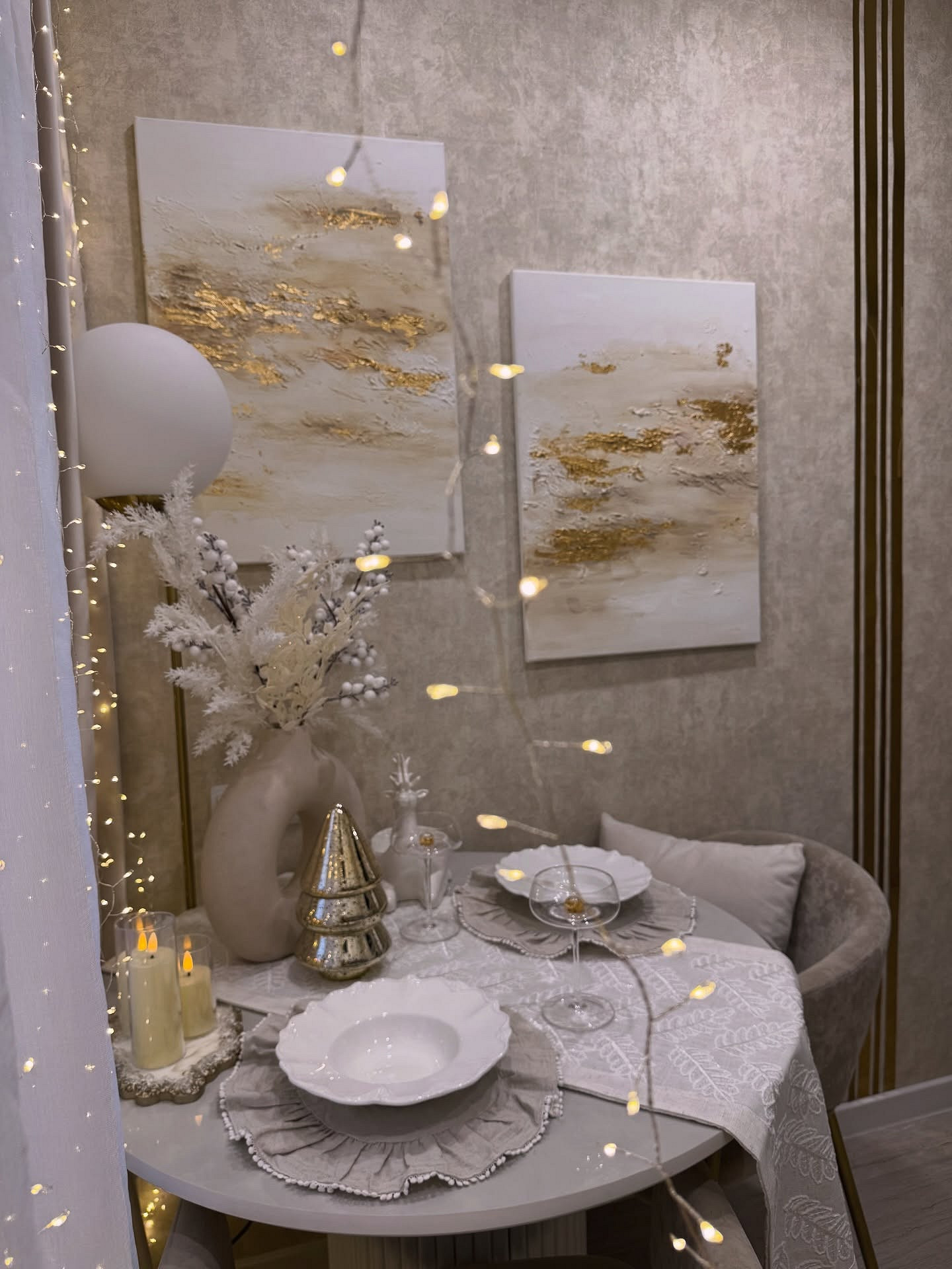 - уютное освещение — свечи и гирлянды с мягким теплым свечением;
