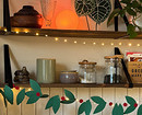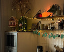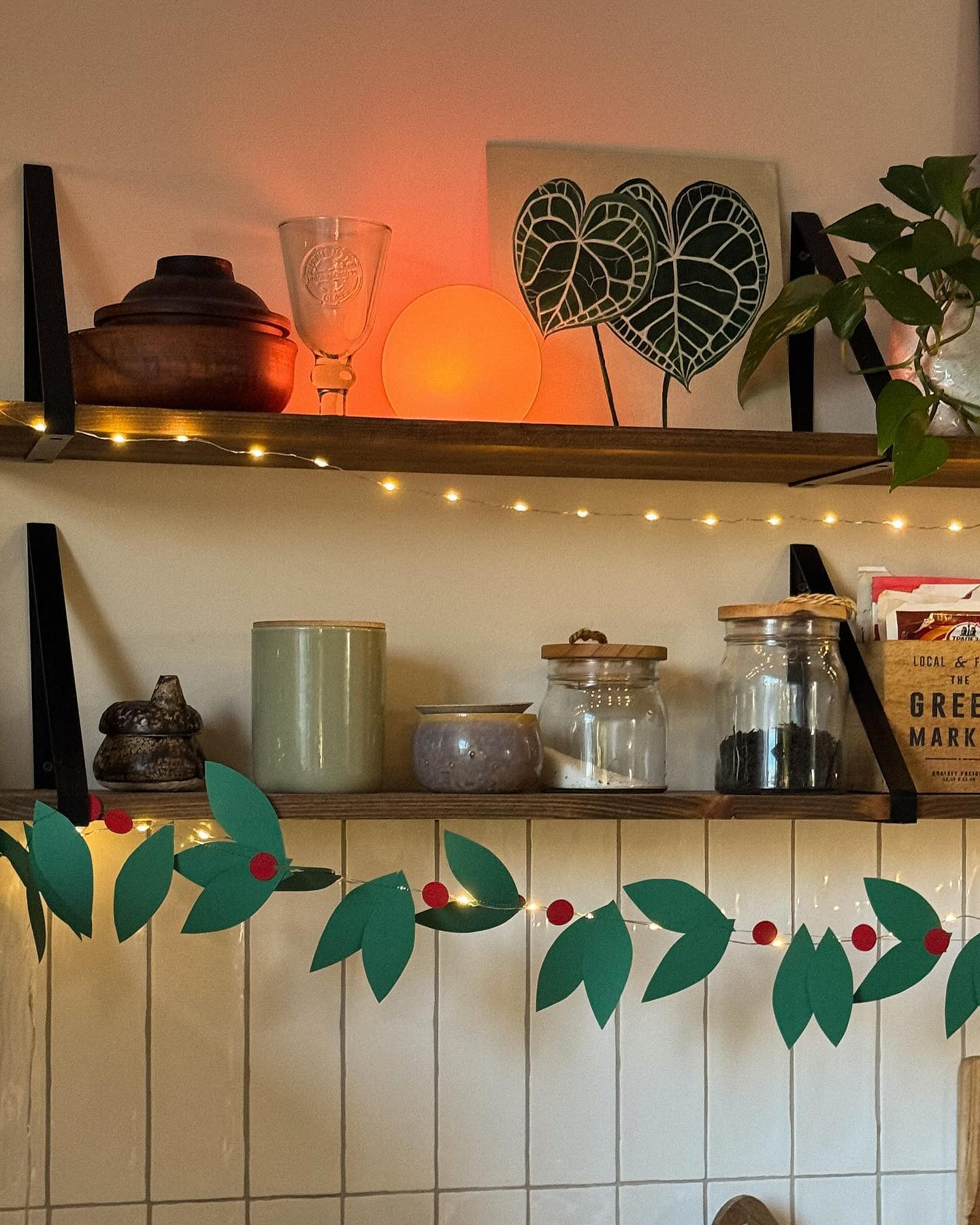 Стены и открытые полки декорируйте гирляндами, бумажными фигурками или небольшим венком. Важно, чтобы аксессуары не мешали готовке и уборке. Избегайте объемных подвесов в рабочей зоне и не размещайте украшения из горючих материалов рядом с плитой.