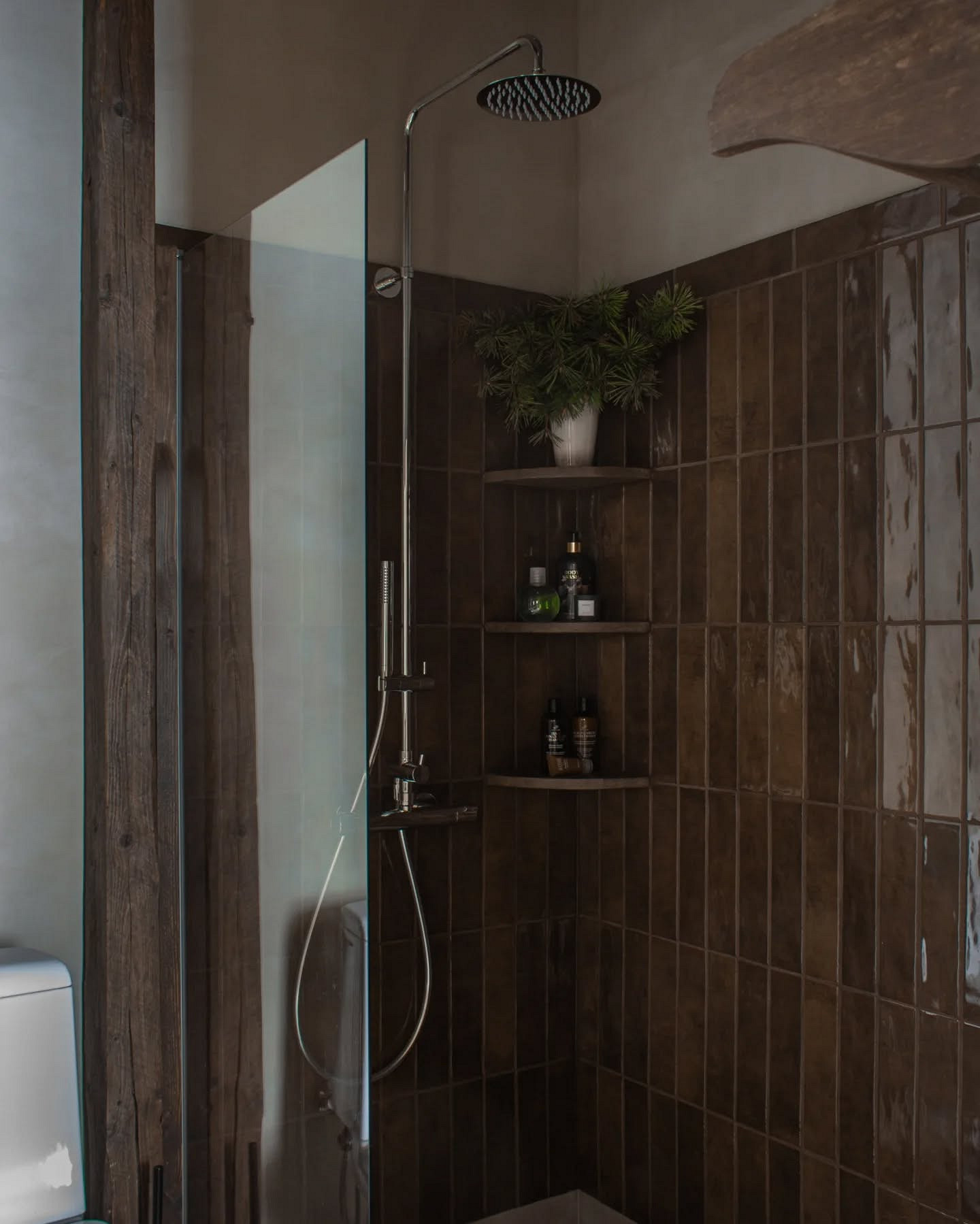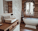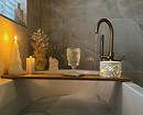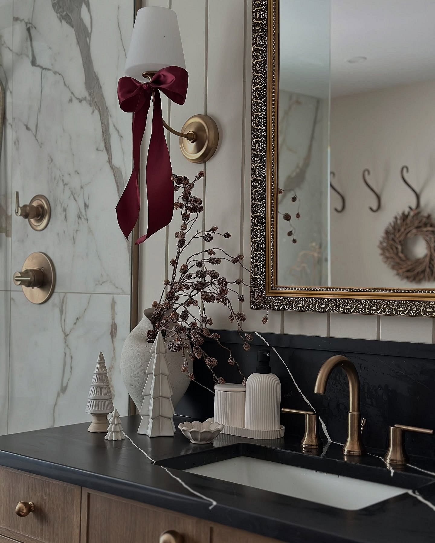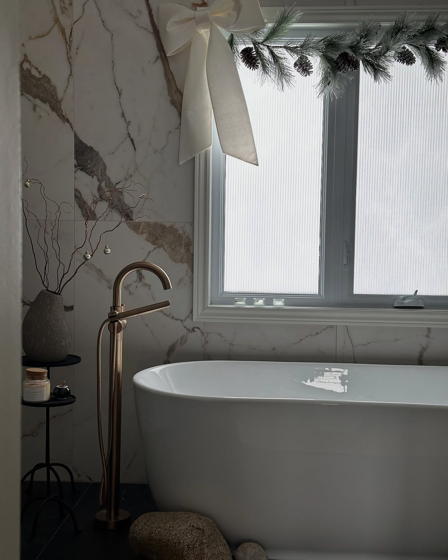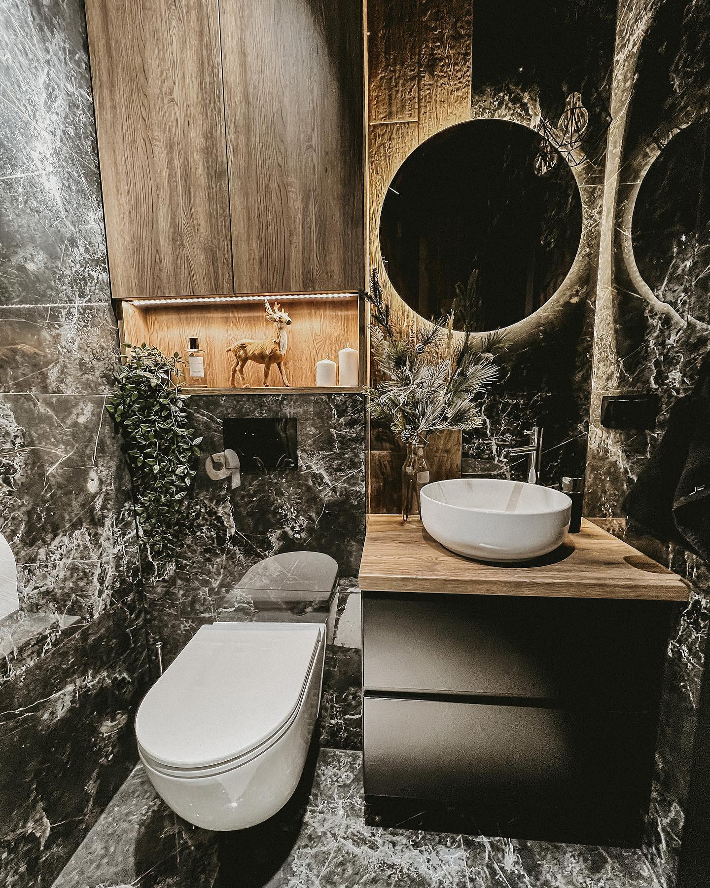 В санузле используют минимум декора, на небольшой площади достаточно пары мелочей. Это может быть нейтральный текстиль, ароматические свечи, еловые или эвкалиптовые ветки в вазе. В просторной ванной можно повесить пару постеров подальше от мокрой зоны. Если хотите повесить гирлянды, выбирайте только модели с влагозащитой и размещайте их вдали от воды. Также не заставляйте мелочами поверхности, чтобы не усложнять уборку.