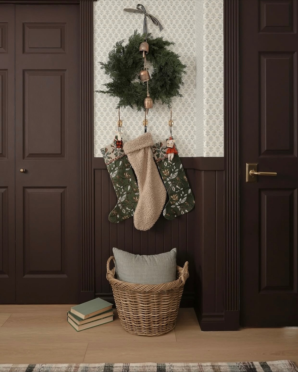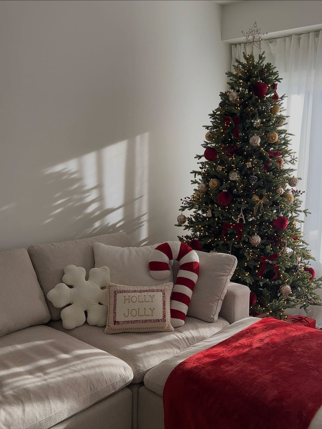 Самые удачные сочетания для новогоднего оформления — теплые нейтральные и более яркие акцентные цвета. Для украшения дома в новом 2026 году подойдут оттенки красного и природные тона зеленого. Если интерьер в стиле минимализм или сканди, можно выбрать более сдержанную палитру с белым, сливочным и бежевым в основе.