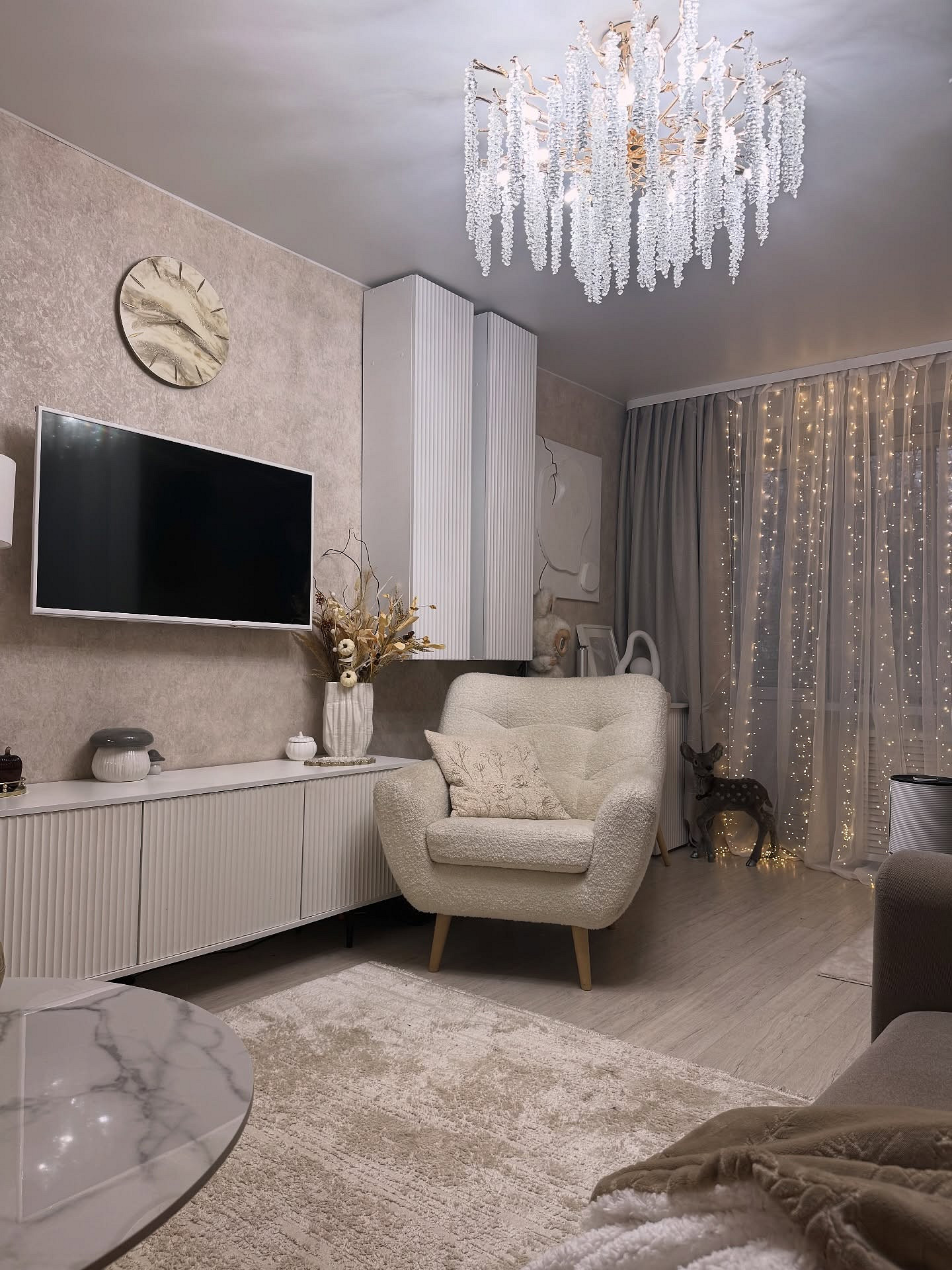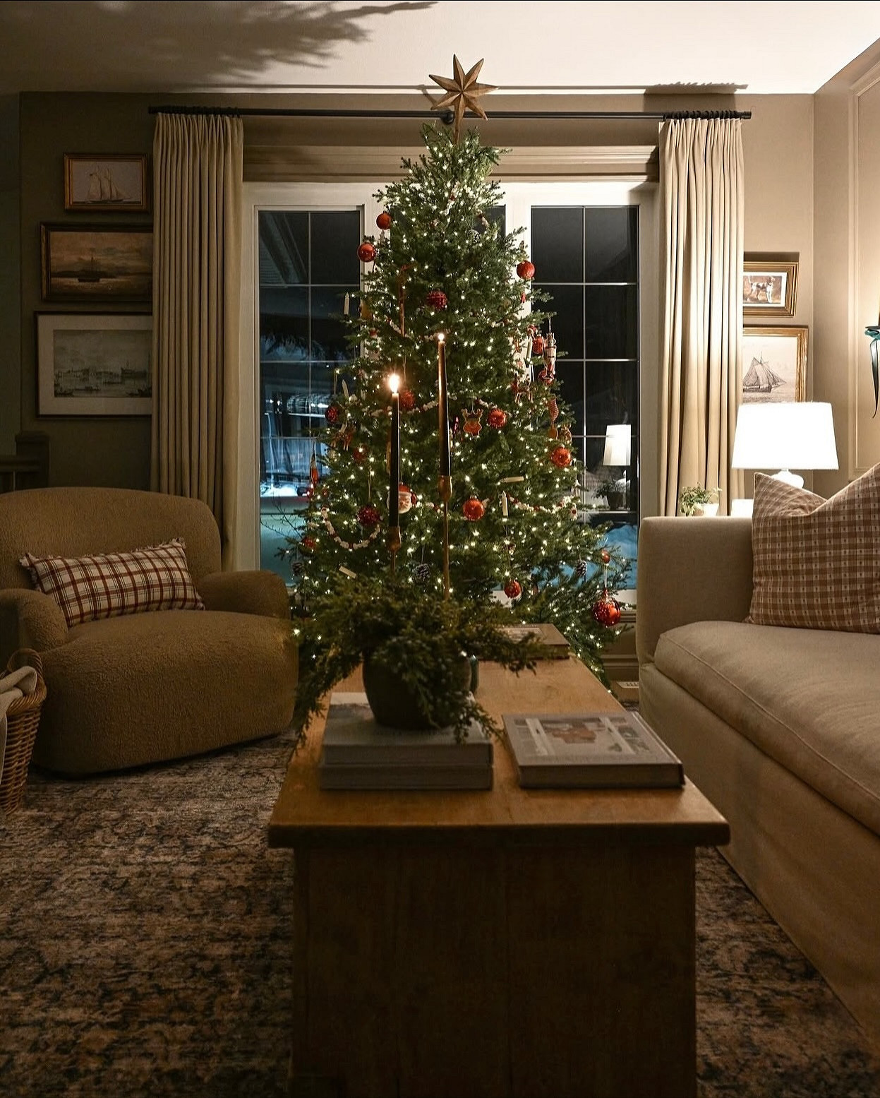 В главной зоне уместен самый выразительный декор: украшенная елка, крупные гирлянды, композиции на журнальном столике. Свет должен быть теплым, слегка рассеянным, без сильного бликования. Если аксессуаров много, повторите один цвет в нескольких элементах. Так они будут визуально сочетаться.