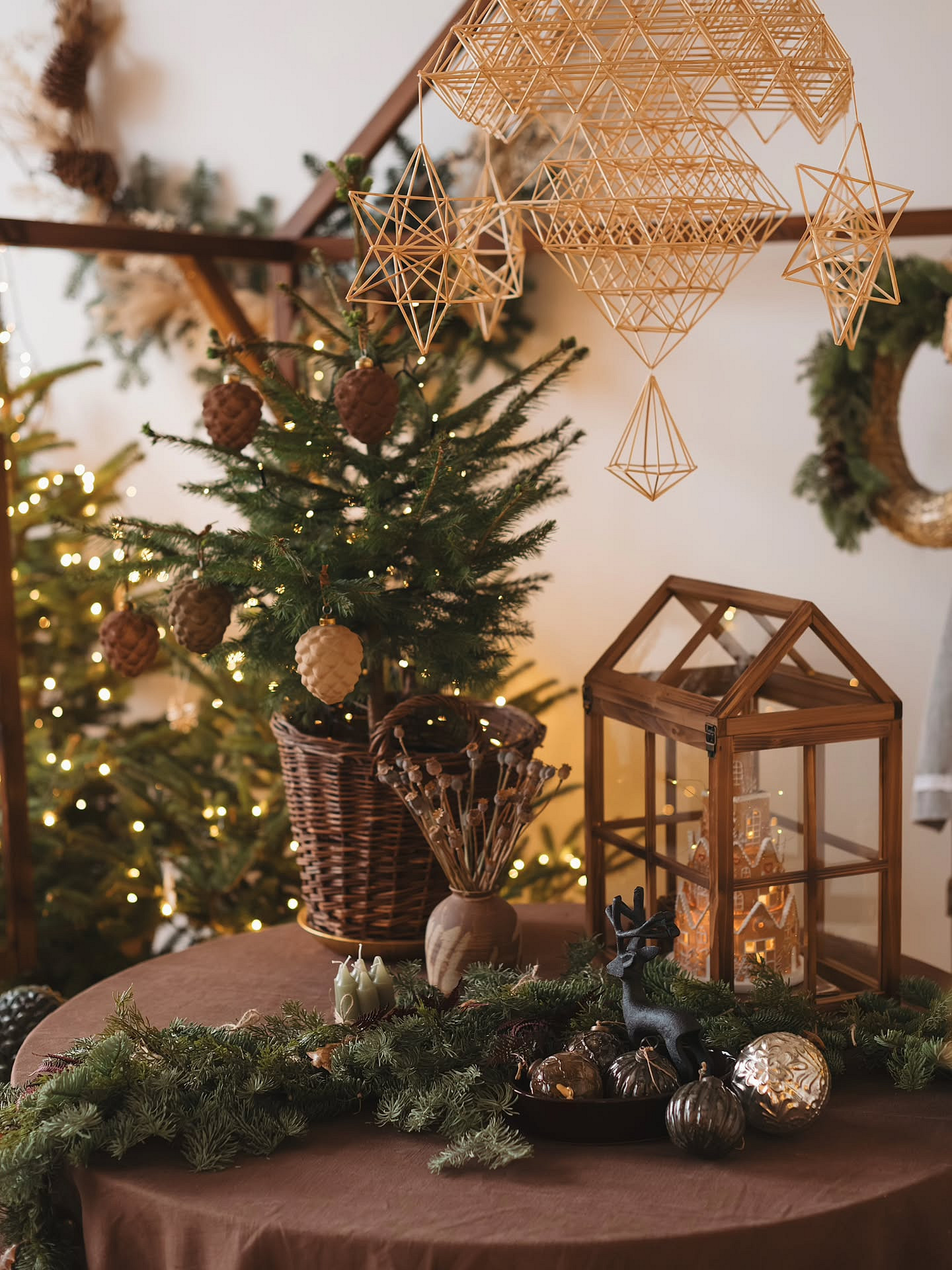 Помимо классических новогодних атрибутов, для создания атмосферы можно использовать и другие детали. В 2026 году дизайнеры советуют выбирать простые, но выразительные элементы: свечи в стекле, фонарики, композиции из шишек и сухофруктов, постеры с зимними сюжетами, адвент-календарь.